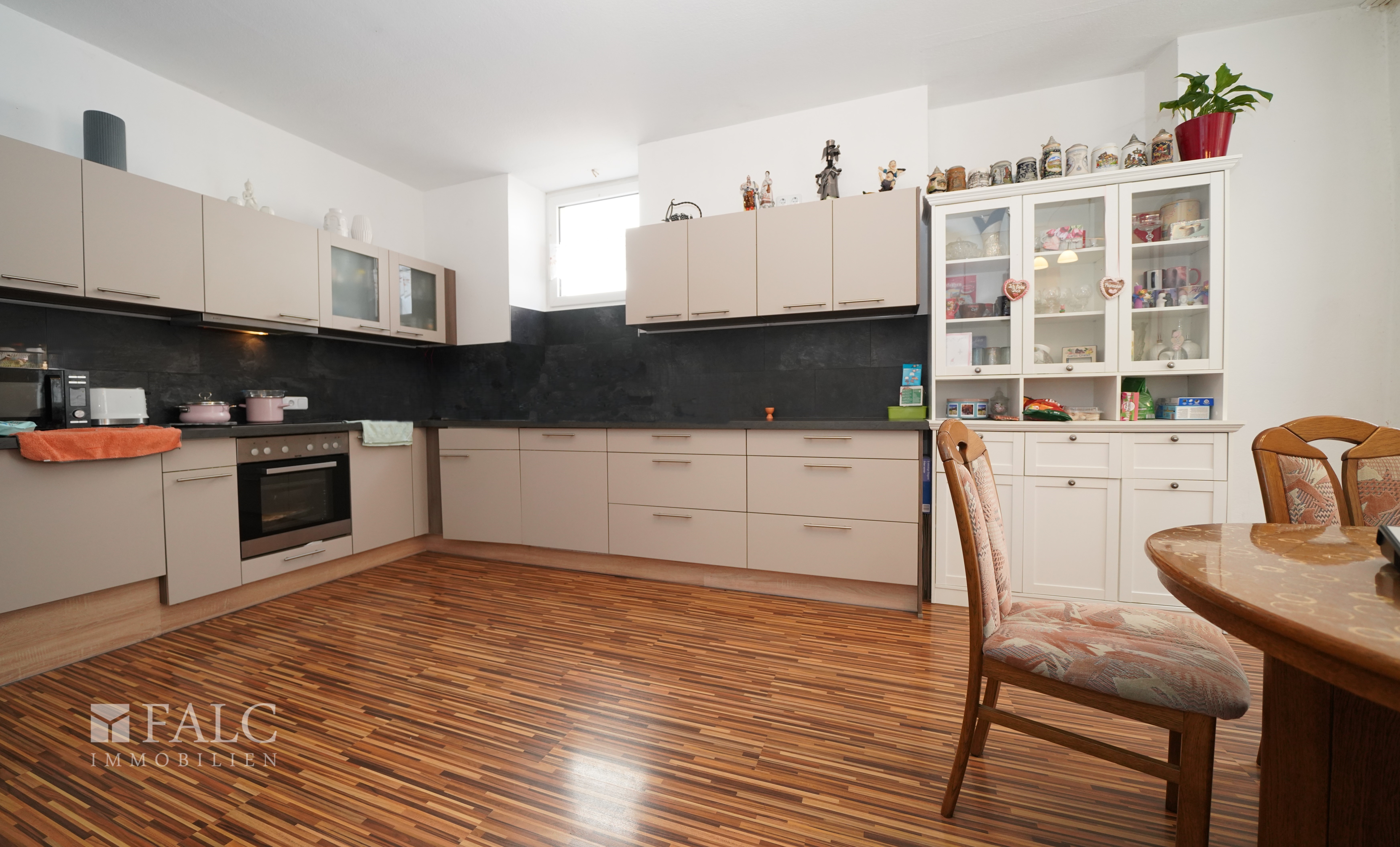 Direkt angrenzend liegt die großzügige Küche. Mit über 22 m² lässt sich hier eine einladende Koch- und Esslandschaft gestalten. Genügend Raum für eine moderne Küche mit großem Esstisch und gemütlichem Beisammensein.