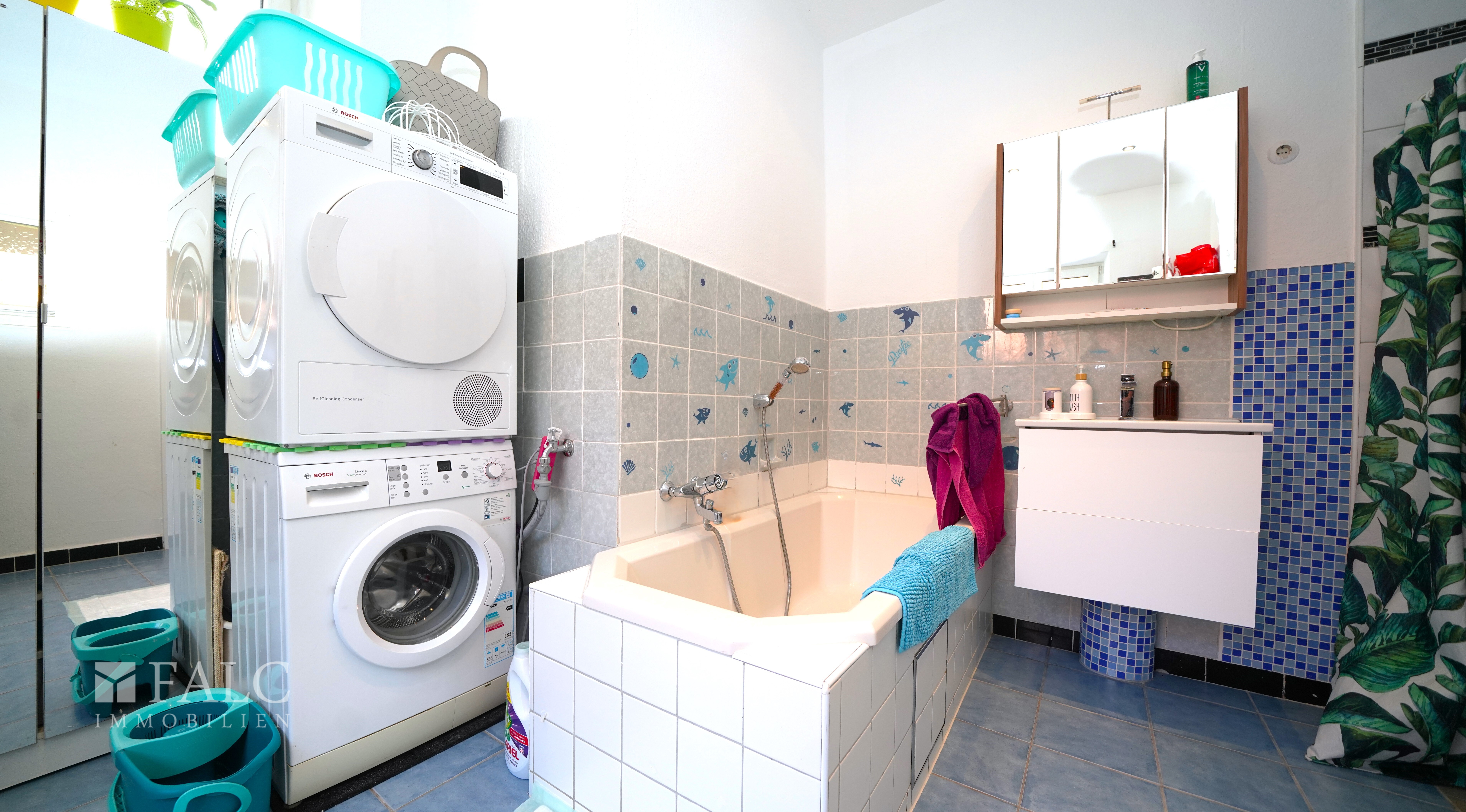 Das Tageslichtbad mit Waschmaschinenanschluss bietet genügend Platz für Ihre tägliche Morgen- und Abendroutine.