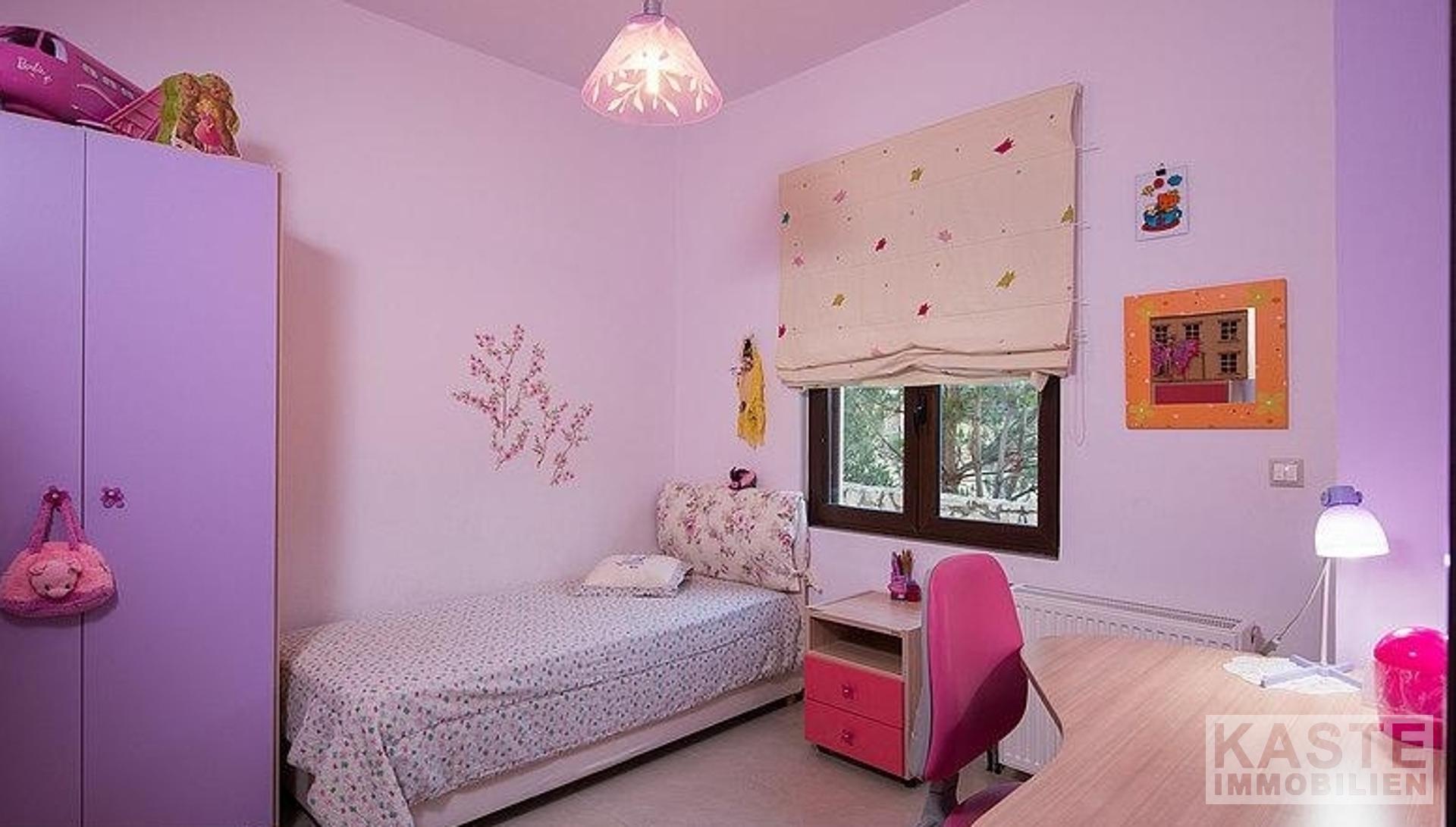 Auf der obersten Ebene der Villa befindet sich das geräumige Hauptschlafzimmer mit einem eigenen Badezimmer und einem begehbaren Kleiderschrank. Auf der gleichen Ebene befindet sich ein weiteres kleines Zimmer, das als Arbeitszimmer genutzt wird und ein Schlafsofa oder einen Fitnessraum beherbergen könnte.