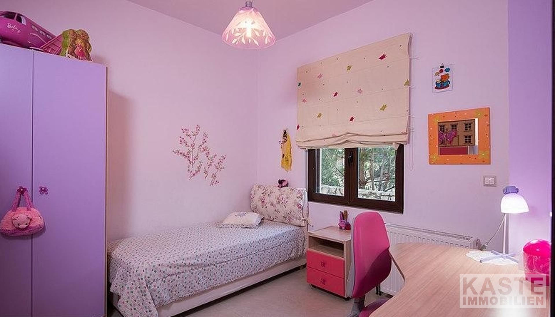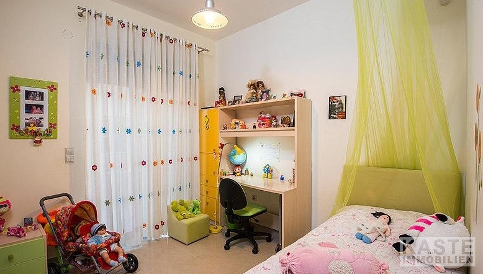Auf der obersten Ebene der Villa befindet sich das geräumige Hauptschlafzimmer mit einem eigenen Badezimmer und einem begehbaren Kleiderschrank. Auf der gleichen Ebene befindet sich ein weiteres kleines Zimmer, das als Arbeitszimmer genutzt wird und ein Schlafsofa oder einen Fitnessraum beherbergen könnte.