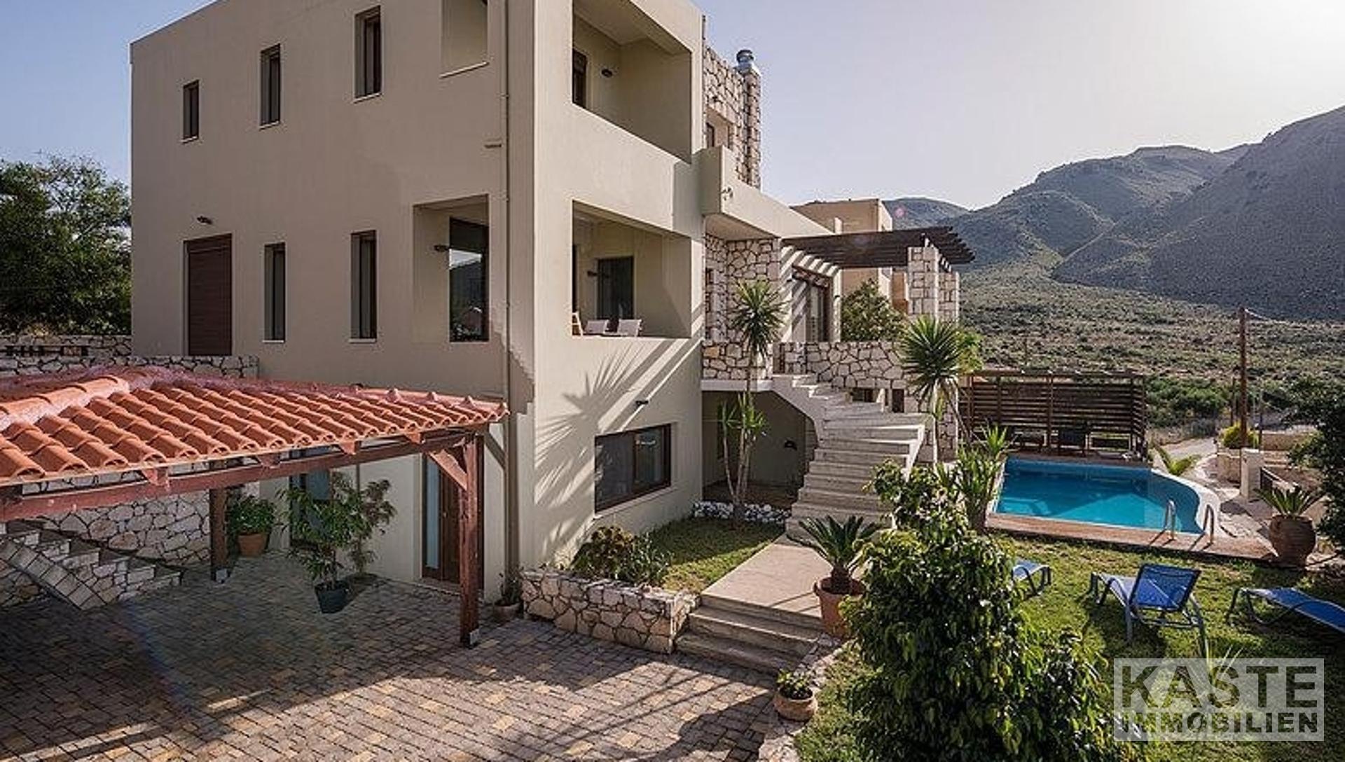Diese hochwertige Villa liegt auf einem Hügel in der Gegend von Apokoronas, nur 16 km von Chania entfernt, und bietet einen ungehinderten Panoramablick auf das Meer und die Berge. Es handelt sich um eine Maisonette-Villa mit 3 Schlafzimmern und 300m2 Wohnfläche auf 3 Ebenen, mit einem privaten Infinity-Pool und einem vollständig angelegten Garten.