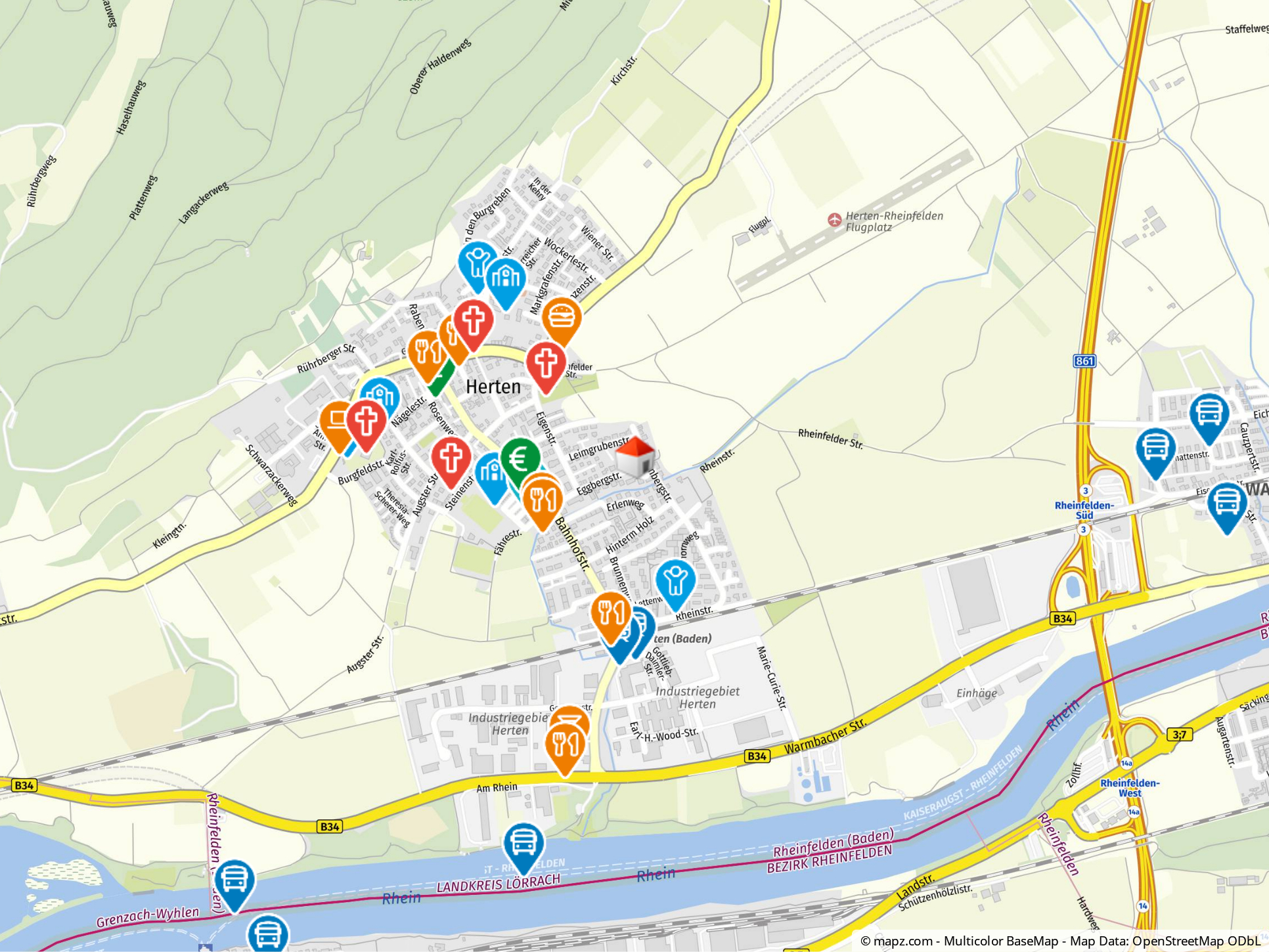 Die Immobilie befindet sich in einer ruhigen und dennoch gut angebundenen Lage in Rheinfelden, Herten (Baden). In unmittelbarer Nähe gibt es mehrere Bushaltestellen, die in etwa fünf Gehminuten erreichbar sind, was eine bequeme Anbindung an den öffentlichen Nahverkehr gewährleistet. Der Bahnhof Herten (Baden) ist ebenfalls in ca. zehn Minuten zu Fuß erreichbar und bietet weitere Möglichkeiten für Pendler.