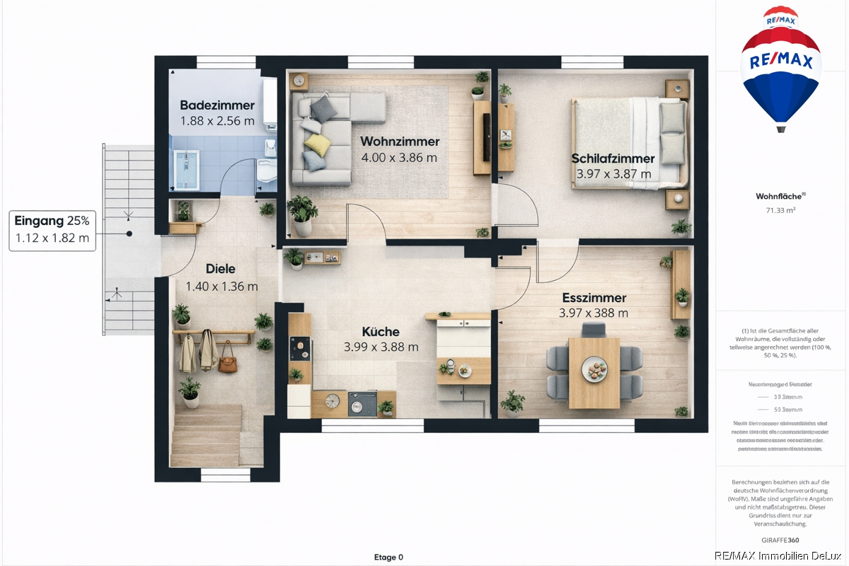 Maklerprovision in Höhe 3,57% inkl. 19 % MwSt. vom Kaufpreis ist mit Abschluss des Kaufvertrages verdient und fällig. Bei einem Verkaufspreis von unter 99.999,99 EUR wird eine Maklerprovision in Höhe von 3.570,00 EUR (pauschal) fällig. RE/MAX erhält einen unmittelbaren Zahlungsanspruch gegenüber dem Käufer (Vertrag zugunsten Dritter, § 328 BGB). Hinweise: Bitte beachten Sie, dass dieses Angebot anhand der uns vom Eigentümer zur Verfügung gestellten Daten und Unterlagen erstellt wurde. Trotz aller Sorgfalt können wir für die Richtigkeit und Vollständigkeit der Angaben keine Gewähr übernehmen. Verbraucherinformationen: Online-Streitbeilegung gemäß Art. 14 Abs. 1 ODR-VO: Die Europäische Kommission stellt eine Plattform zur Online-Streitbeilegung (OS) bereit, die Sie hier finden: ec.europa.eu/consumers/odr