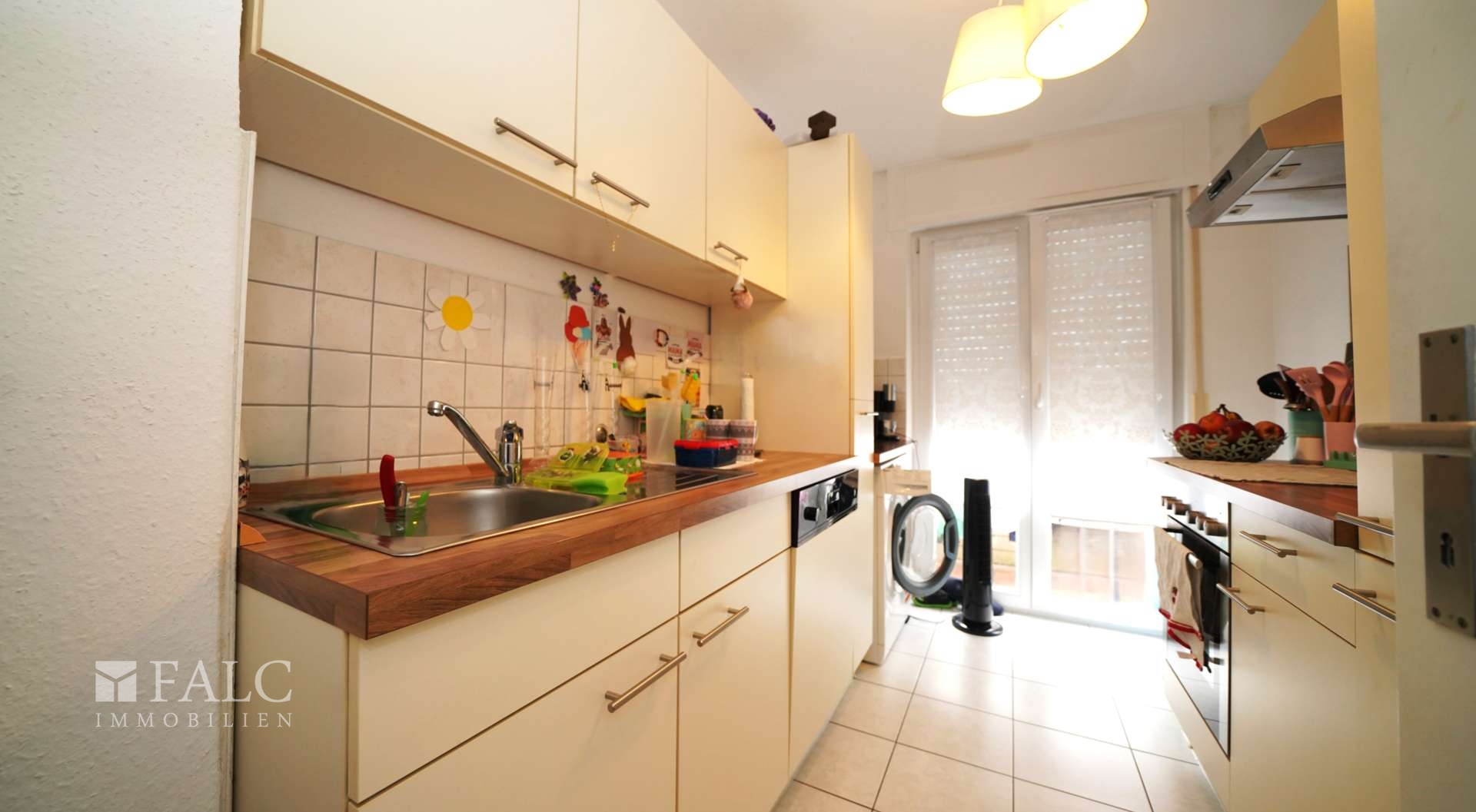 Die funktionale Küche überzeugt mit ausreichend Platz für Ihre kulinarischen Ideen und bietet direkten Zugang zum Balkon. Sie ist mit pflegeleichten Bodenfliesen sowie einer Küchenrückwand in moderner Weiß-Grau-Optik ausgestattet. Perfekt auf die in beige gehaltene Einbauküche abgestimmt.
