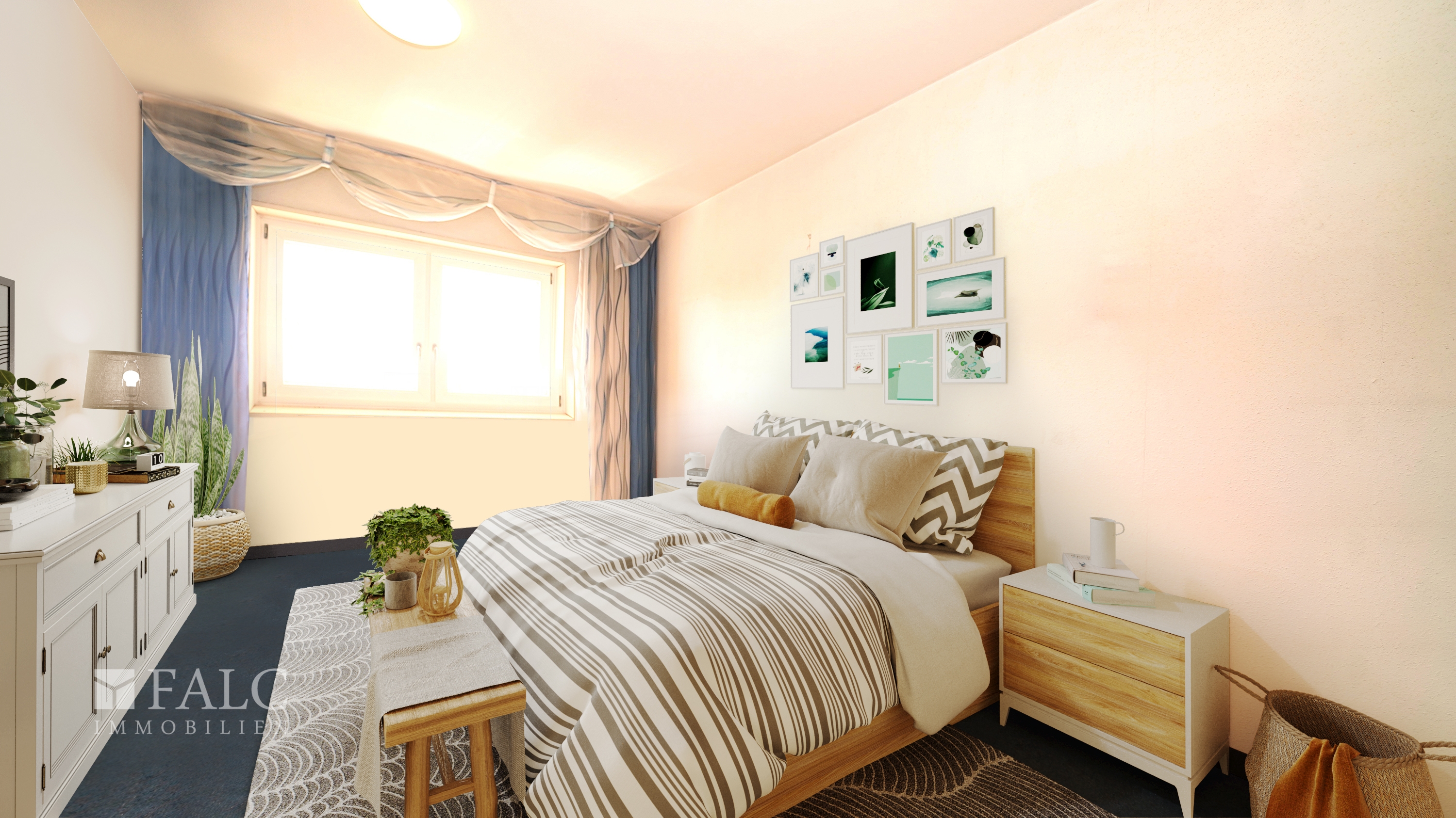 Auf der gegenüberliegenden Seite befinden sich die beiden Schlafzimmer, die vor allem Familien begeistern werden. Das Elternschlafzimmer besticht durch ein großes Fenster, das viel Tageslicht hereinlässt und bietet mit rund 14 m² ausreichend Platz für individuelle Wohnideen. Gleich daneben liegt das Kinderzimmer mit einem eigenen Fenster, das sich ideal als Rückzugsort eignet.