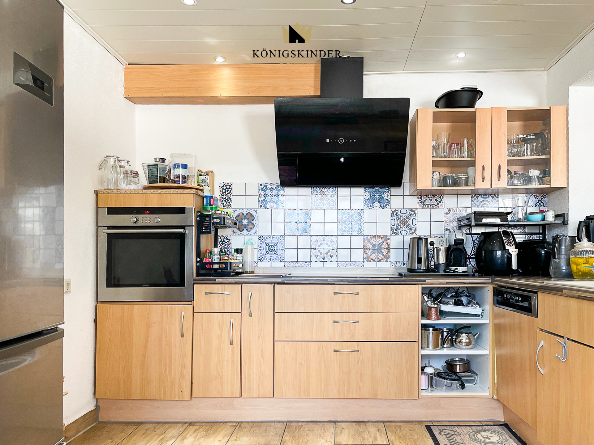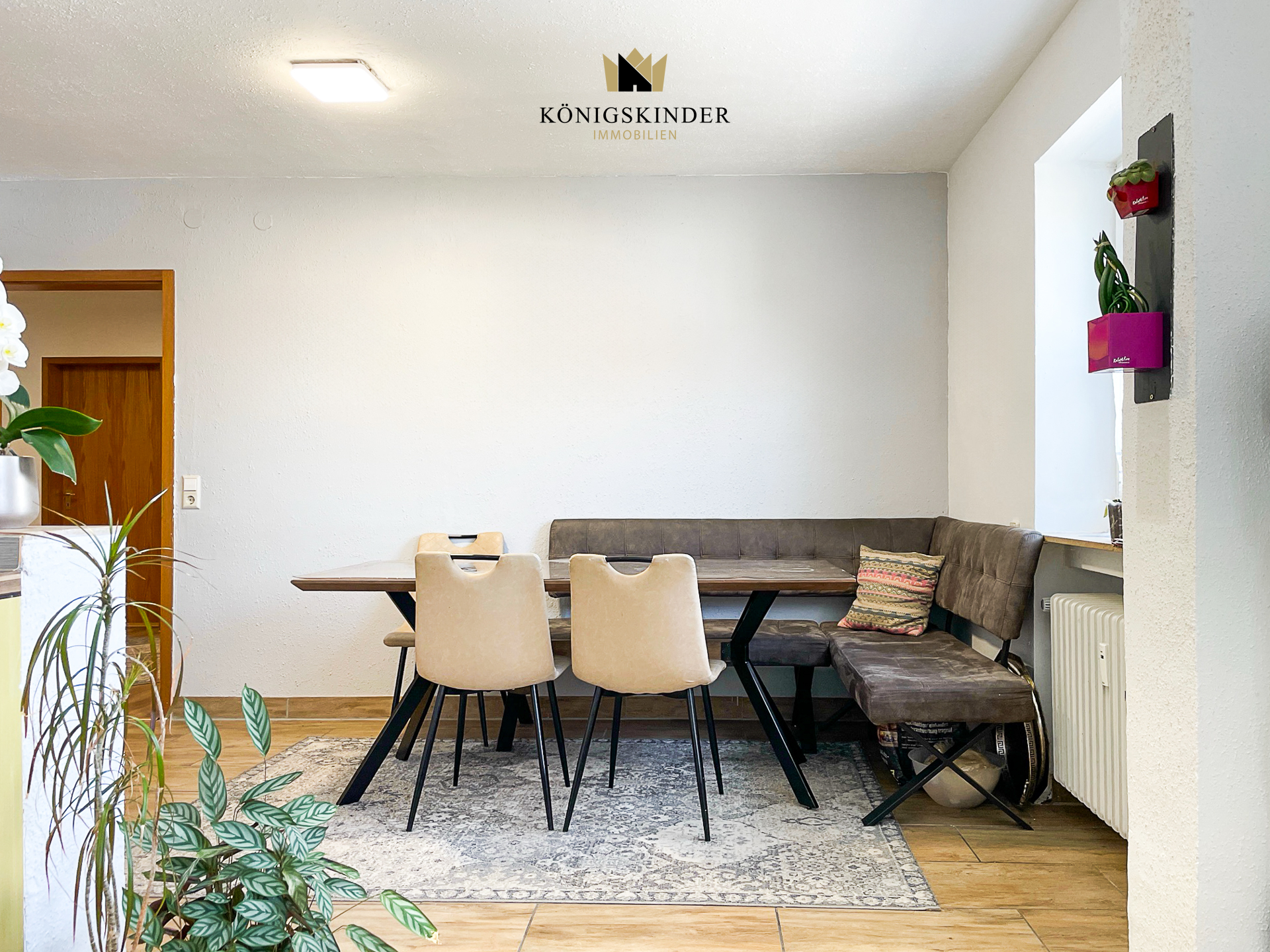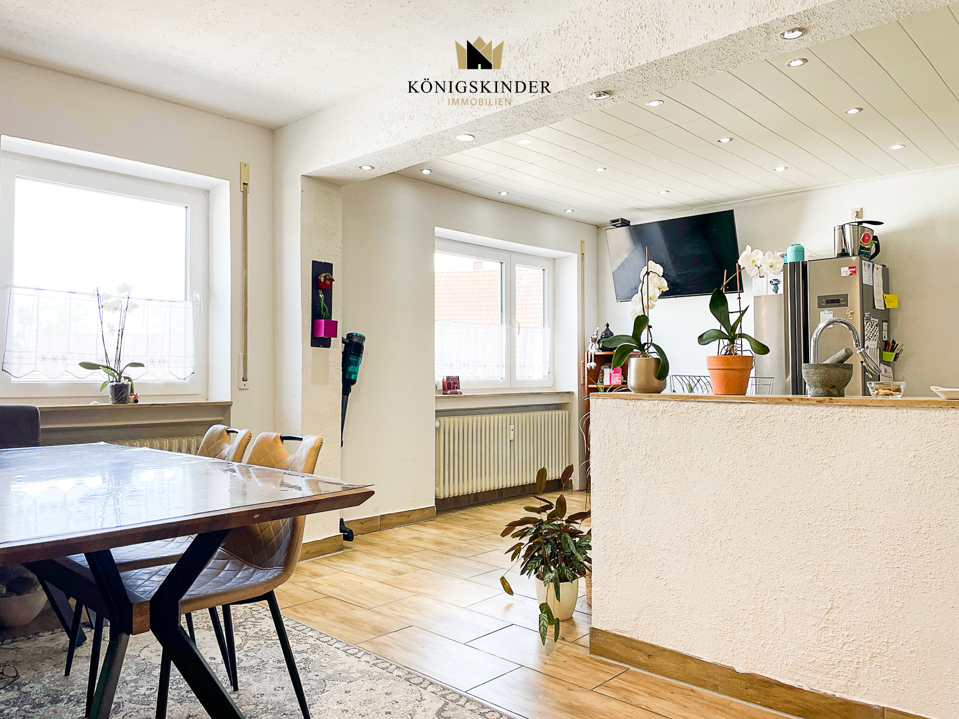 Daneben finden Sie die große Wohnküche mit großzügigem Essbereich und einer Thekenküche.