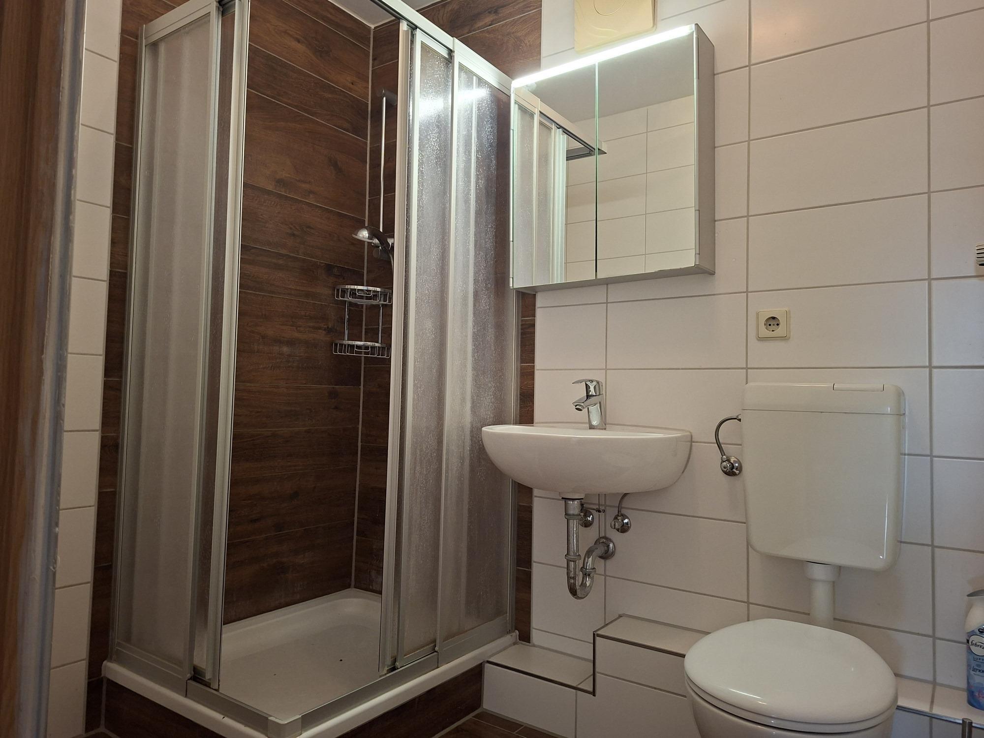 Das innenliegende Bad ist neu gefliest und mit einer Dusche, Waschbecken und WC sowie Spiegelschrank ausgestattet.