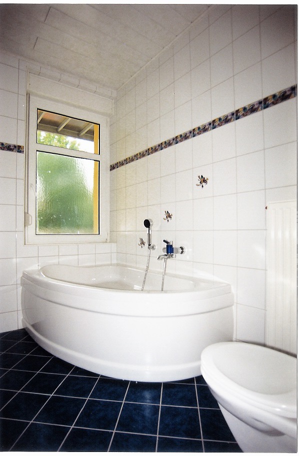 Das Tageslichtbad ist raumhoch gefliest, es verfügt über eine Eckbadewanne und eine separate Dusche mit Glastür. Des Weiteren ist das Bad mit Einbaubadmöbeln mit Ober-/Unterschränken und Ablagen sowie integriertem Spiegel mit Halogenbeleuchtung und Steckdosen ausgestattet.