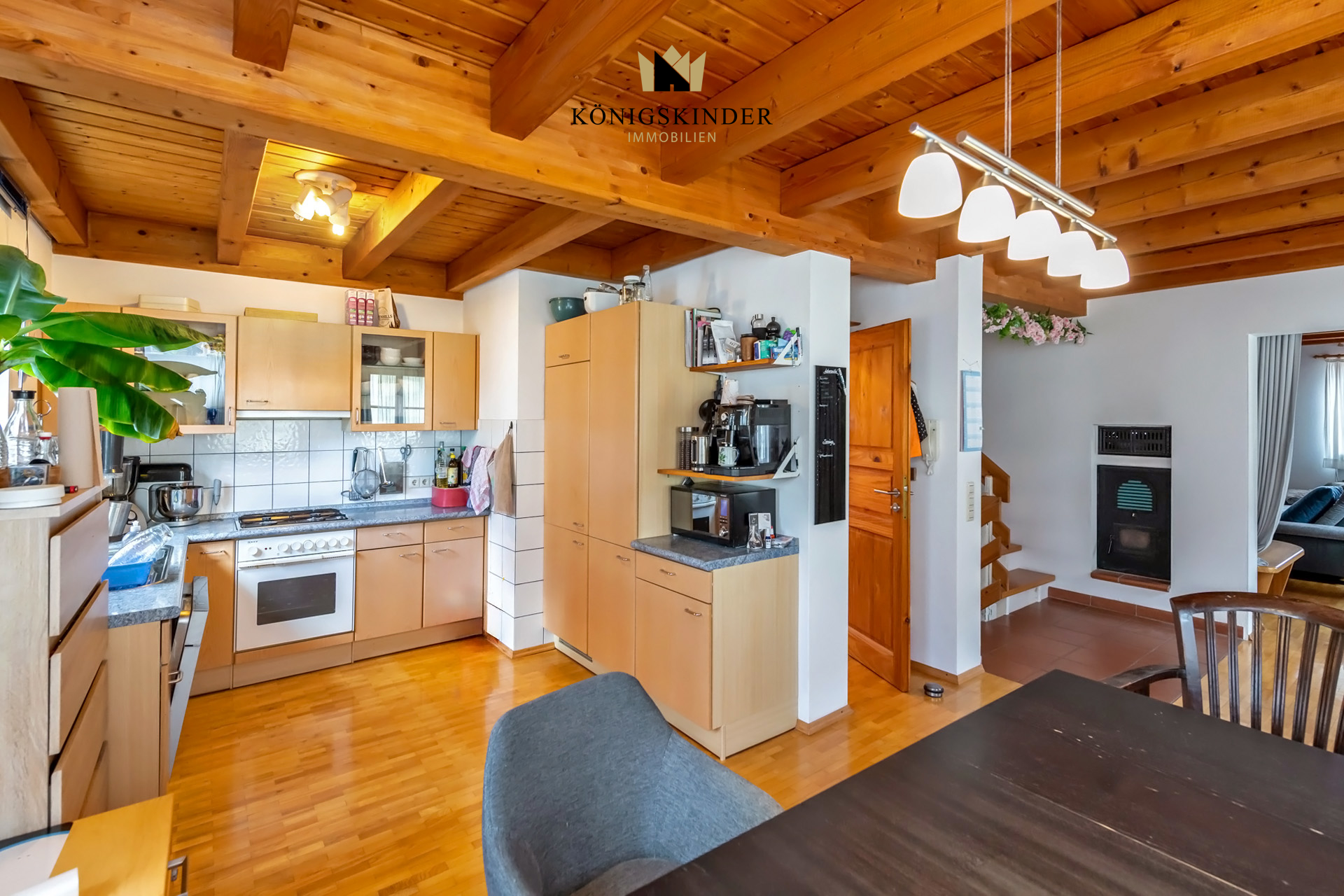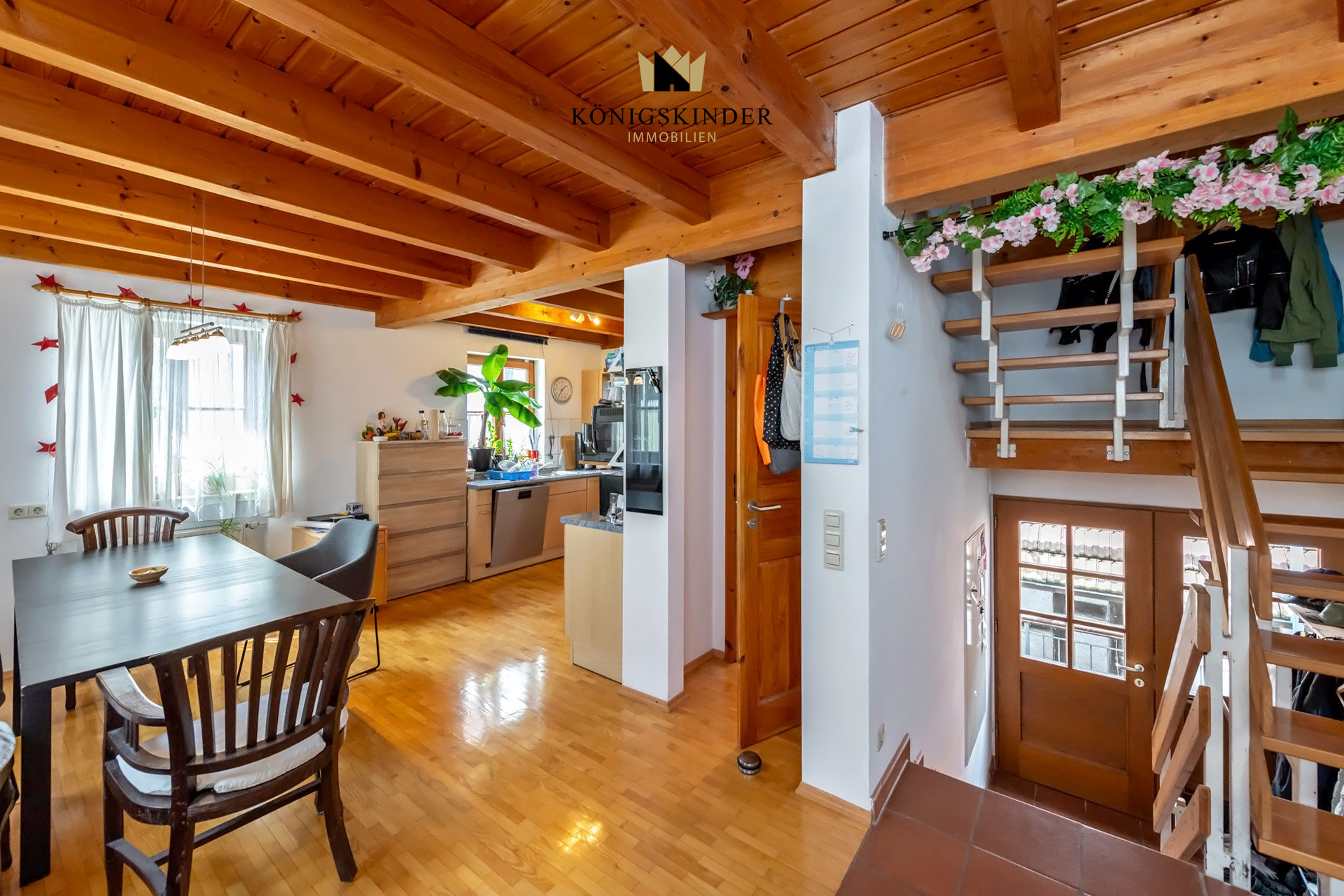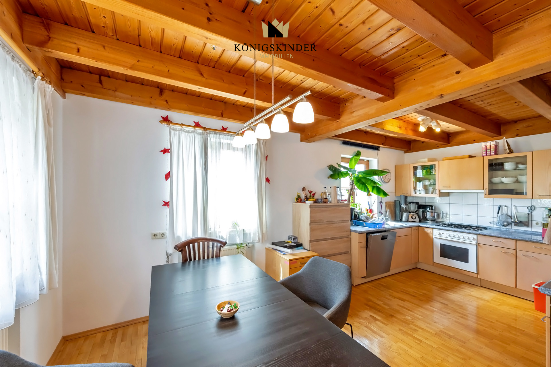 Die darüberliegende Wohneinheit erstreckt sich über das Ober- und Dachgeschoss und bietet rund 90 m² Wohnfläche. Im Obergeschoss befinden sich ein heller Essbereich mit angrenzender Küche sowie ein separates Wohnzimmer. Ein Gäste-WC ergänzt das Raumangebot auf dieser Etage.