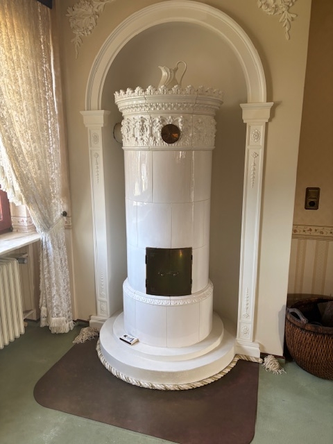 Kachelofen im Obergeschoss, mit besonders hochwertiger Keramik gemauert
