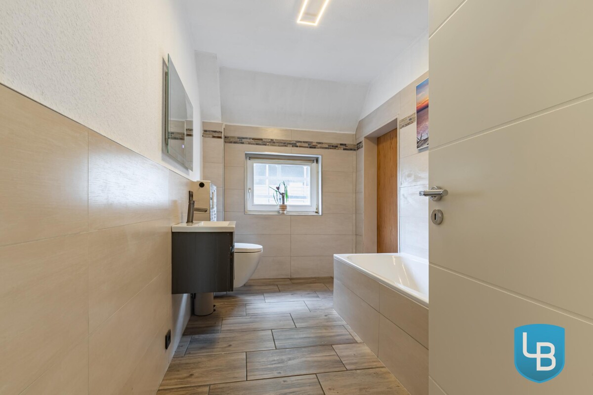 Im Erdgeschoss empfängt Sie eine helle, stilvoll gestaltete Wohnküche mit gemütlicher Sitzecke. Das moderne Wannenbad (Bj. 2022) verfügt über einen Waschtisch mit Unterschrank und bietet direkten Zugang zum Hauswirtschaftsraum. Ein großzügiger Wohn- und Essbereich mit offener Wendeltreppe schafft dank Kaminofen eine besonders behagliche Atmosphäre an kühlen Tagen.