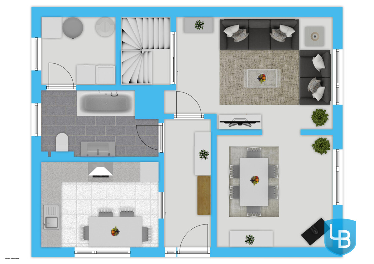 + Flur + Moderne, voll ausgestattete Küche + Großes Wohn- und Esszimmer mit Wendeltreppe zum DG + Modernes Wannenbad mit Fenster + Hauswirtschaftsraum mit Fenster