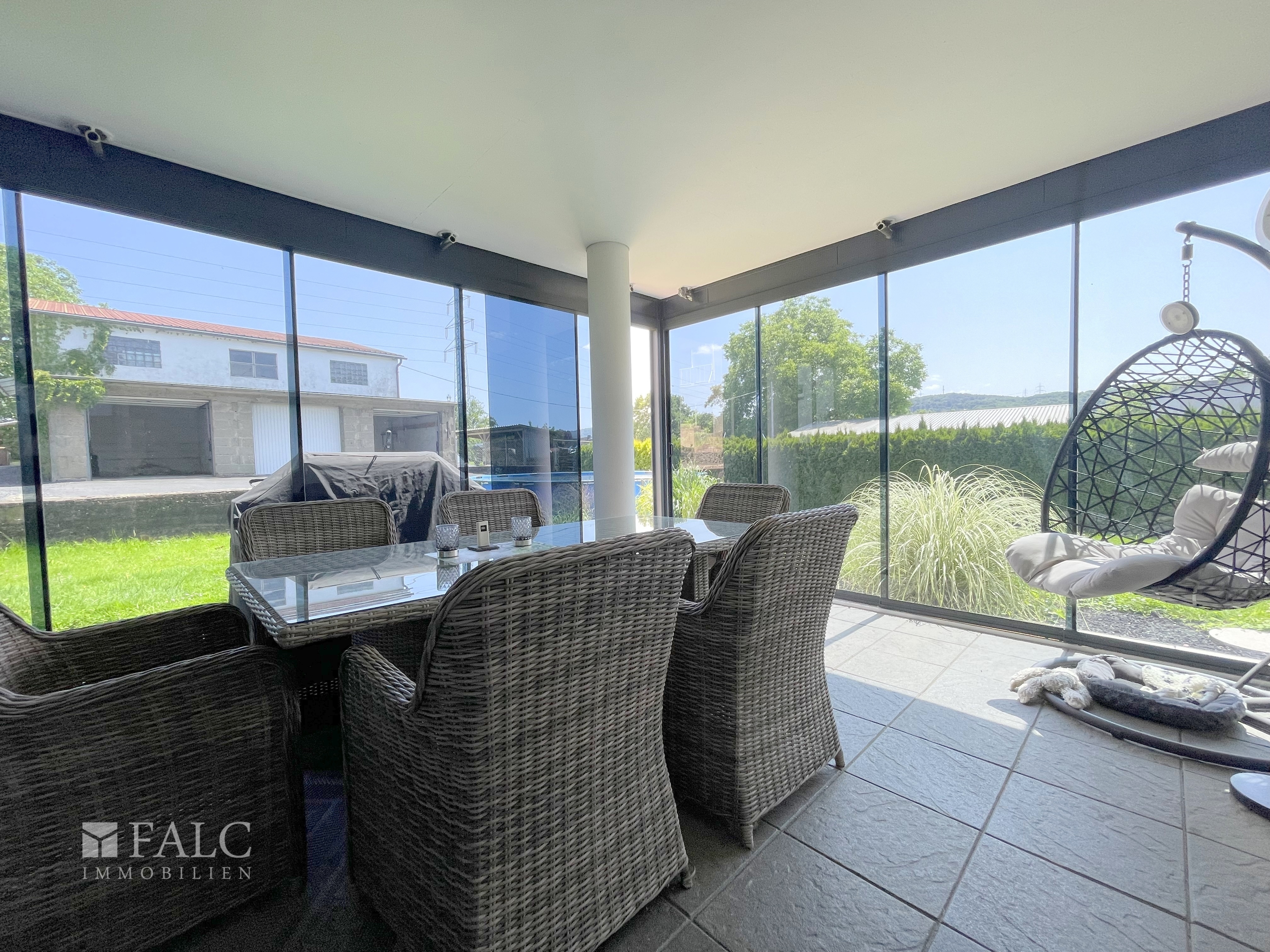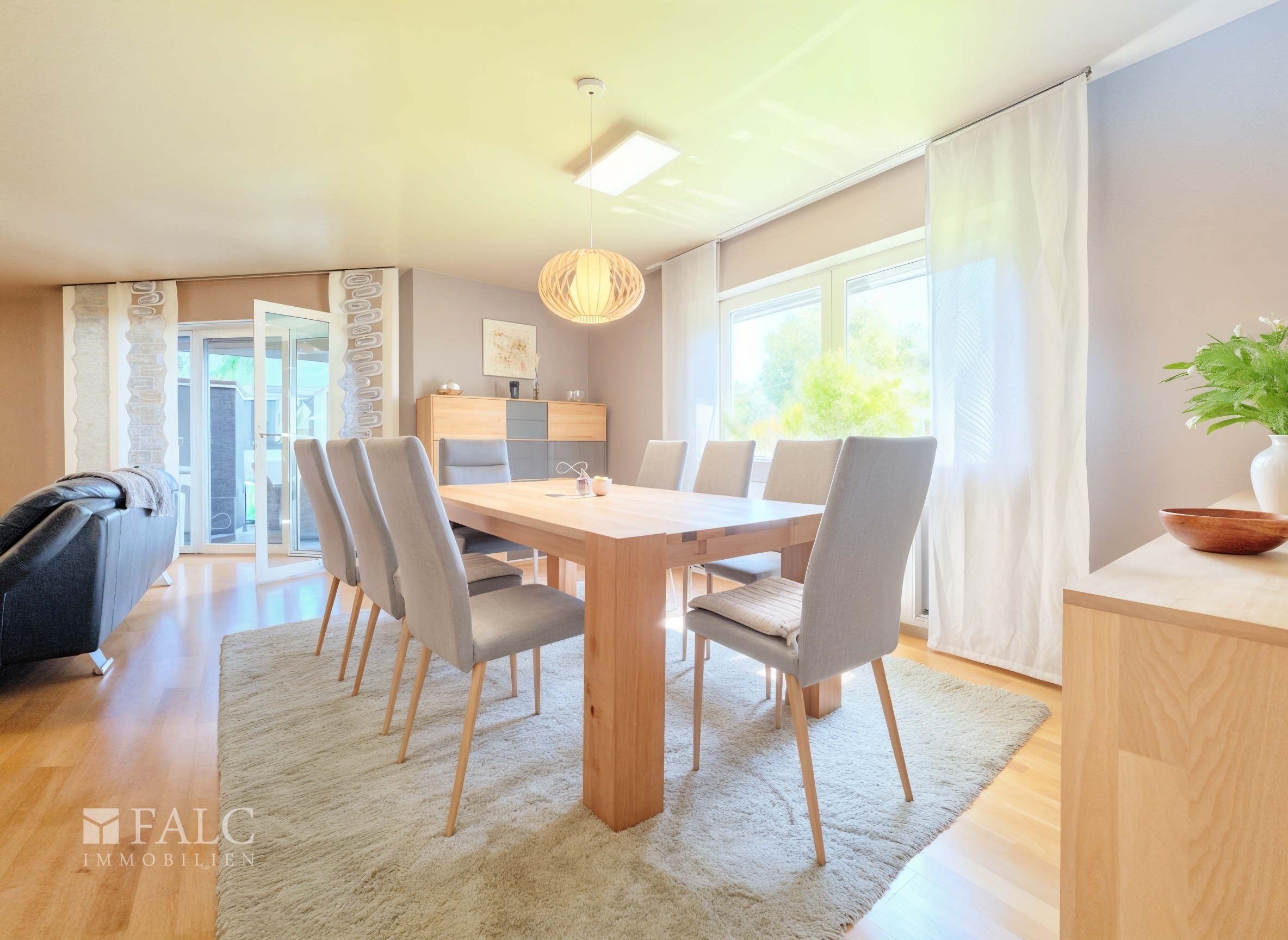 Zur rechten Seite des Eingangsbereichs erschließt sich der offene Wohnbereich. Die separate Küche ist praktisch geschnitten und verfügt über einen angrenzenden Abstellraum, in dem auch die Heizungsanlage untergebracht ist. Das geräumige Wohnzimmer mit Kamin bietet ausreichend Platz für einen gemütlichen Wohn- und Essbereich und führt direkt in den beheizbaren Wintergarten – ein idealer Rückzugsort für jede Jahreszeit. Von hier aus hat man Zugang zum traumhaften Garten, der zum Verweilen im Grünen einlädt.