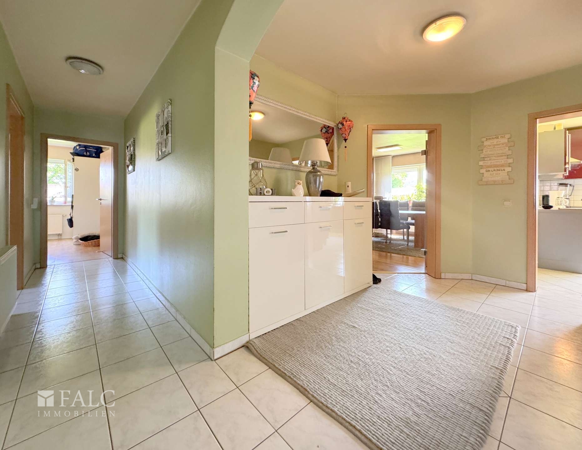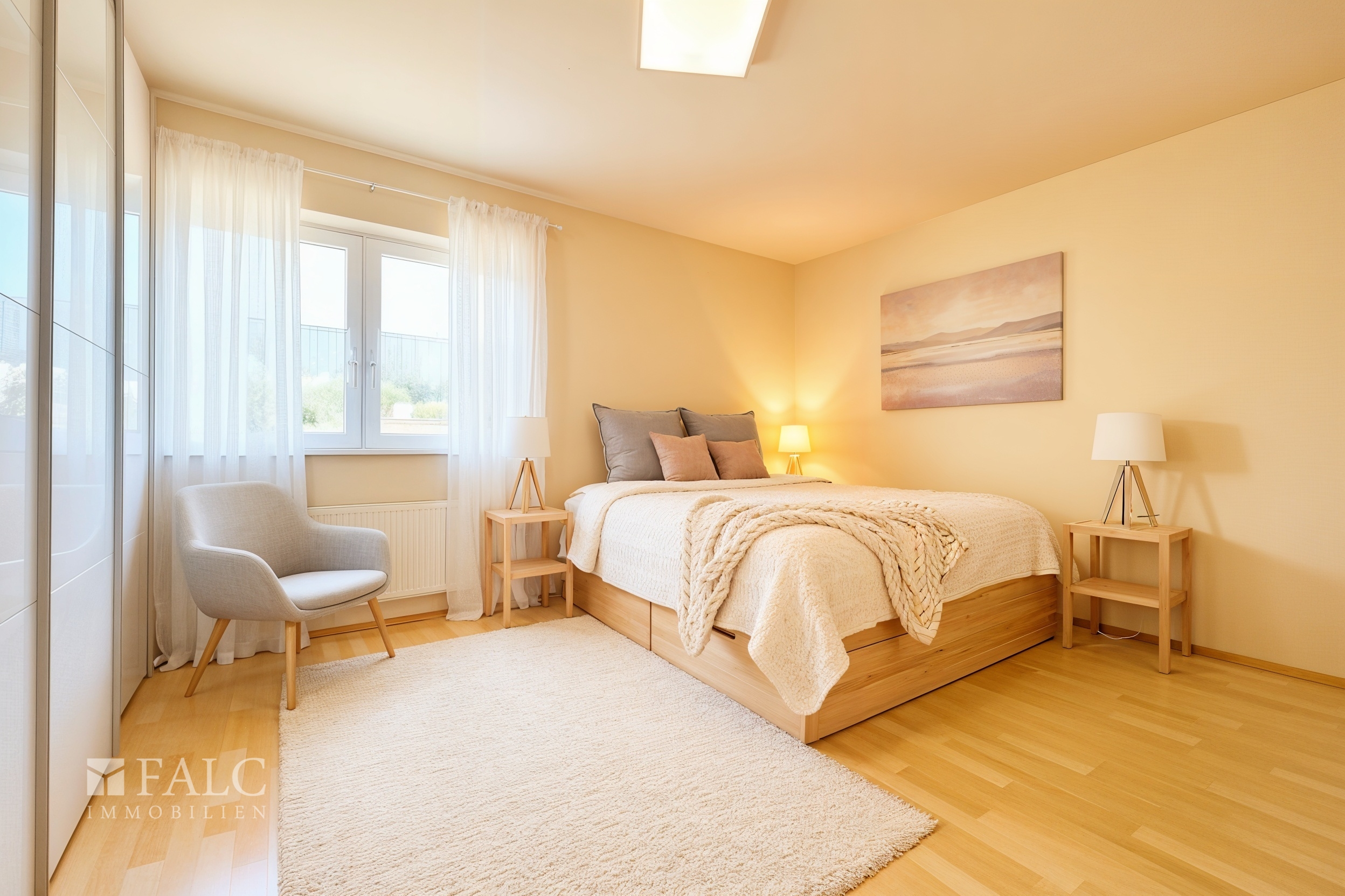 Beim Betreten der Wohnung gelangt man zunächst in einen großzügigen Eingangsbereich, der einen zentralen Zugang zu allen Räumen ermöglicht. Auf der linken Seite befinden sich ein großes Schlafzimmer, das Tageslichtbad mit Dusche und Badewanne sowie ein separates Gäste-WC. Ein angrenzender Flur führt zu zwei weiteren Schlafzimmern, die sich flexibel als Kinderzimmer, Büro oder Gästezimmer nutzen lassen.