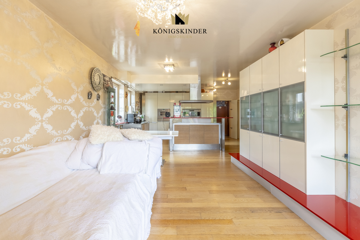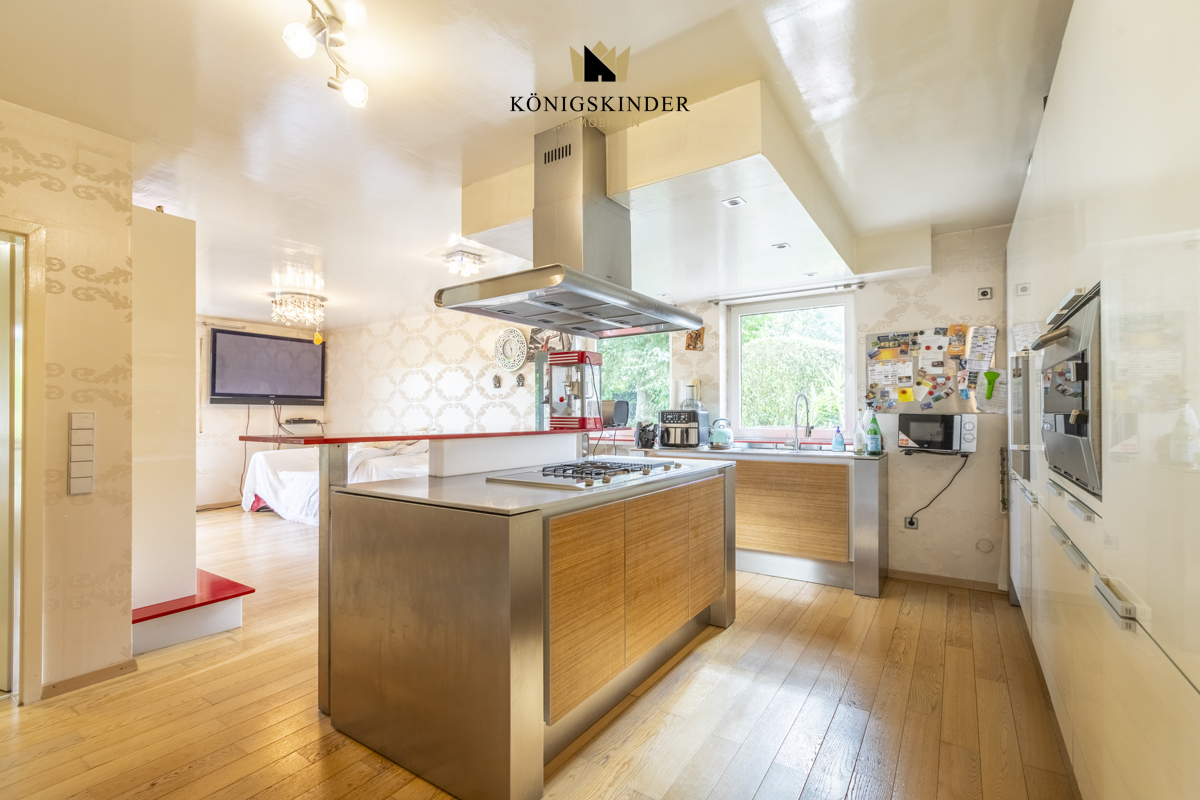 Die offene Wohnküche mit Kochinsel und Gasanschluß ist mit einer Poggenpohl-Einbauküche mit hochwertigen Gaggenau-Geräten ausgestattet und bietet alles, um gepflegte Kulinarik zu genießen.
