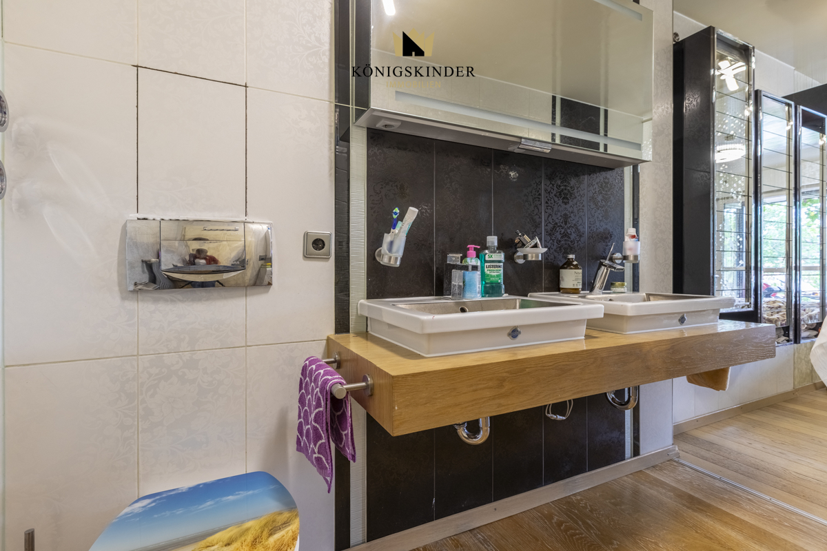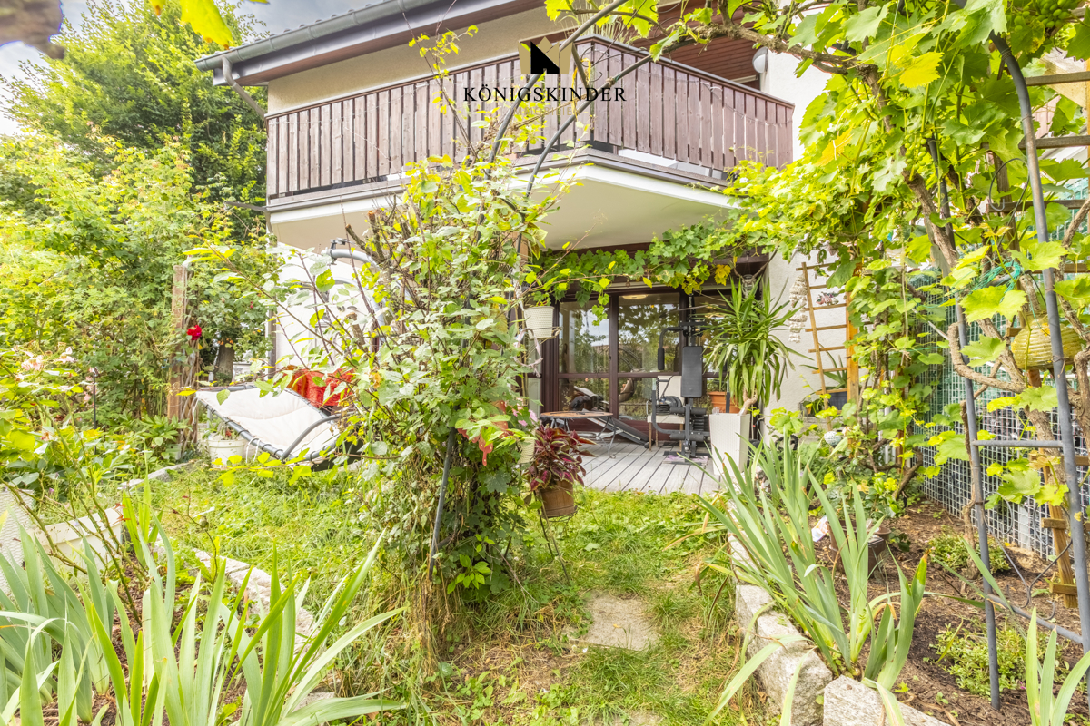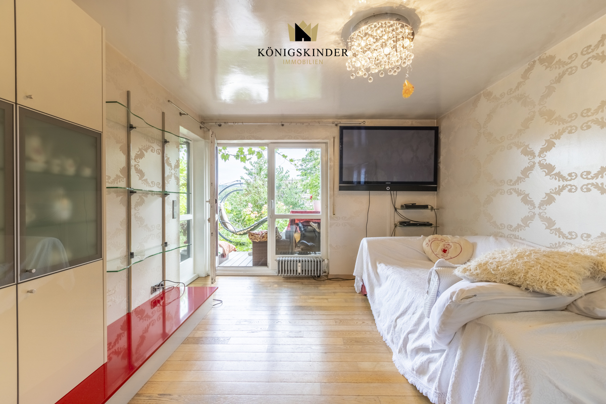 Dies wurde durch die Zusammenlegung dieser drei Räumlichkeiten interessant realisiert, wobei das separate Zimmer ein eigenes Bad mit WC sowie eine optionale Küchenzeile und eine eigene Terrasse mit kleinem Gartenanteil besitzt - der Terrassenbereich wie auch der Garten sind ansonsten umlaufend.