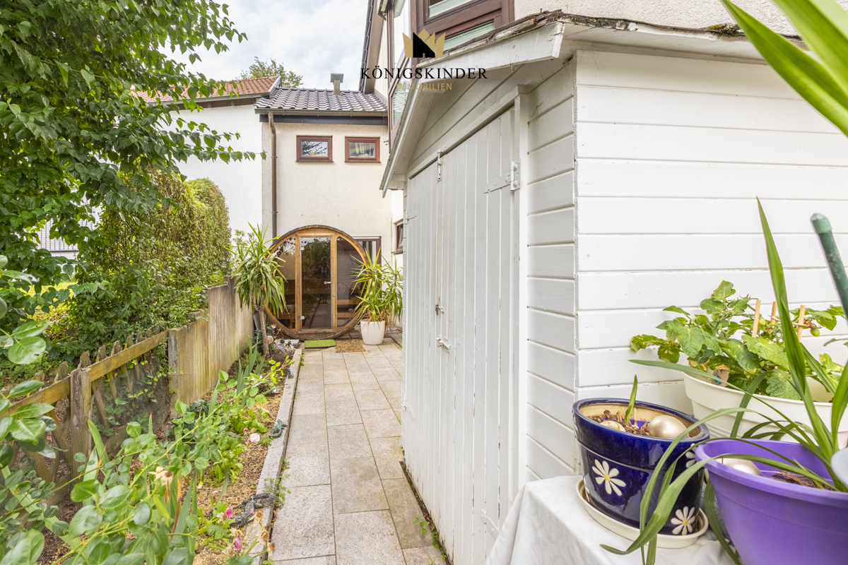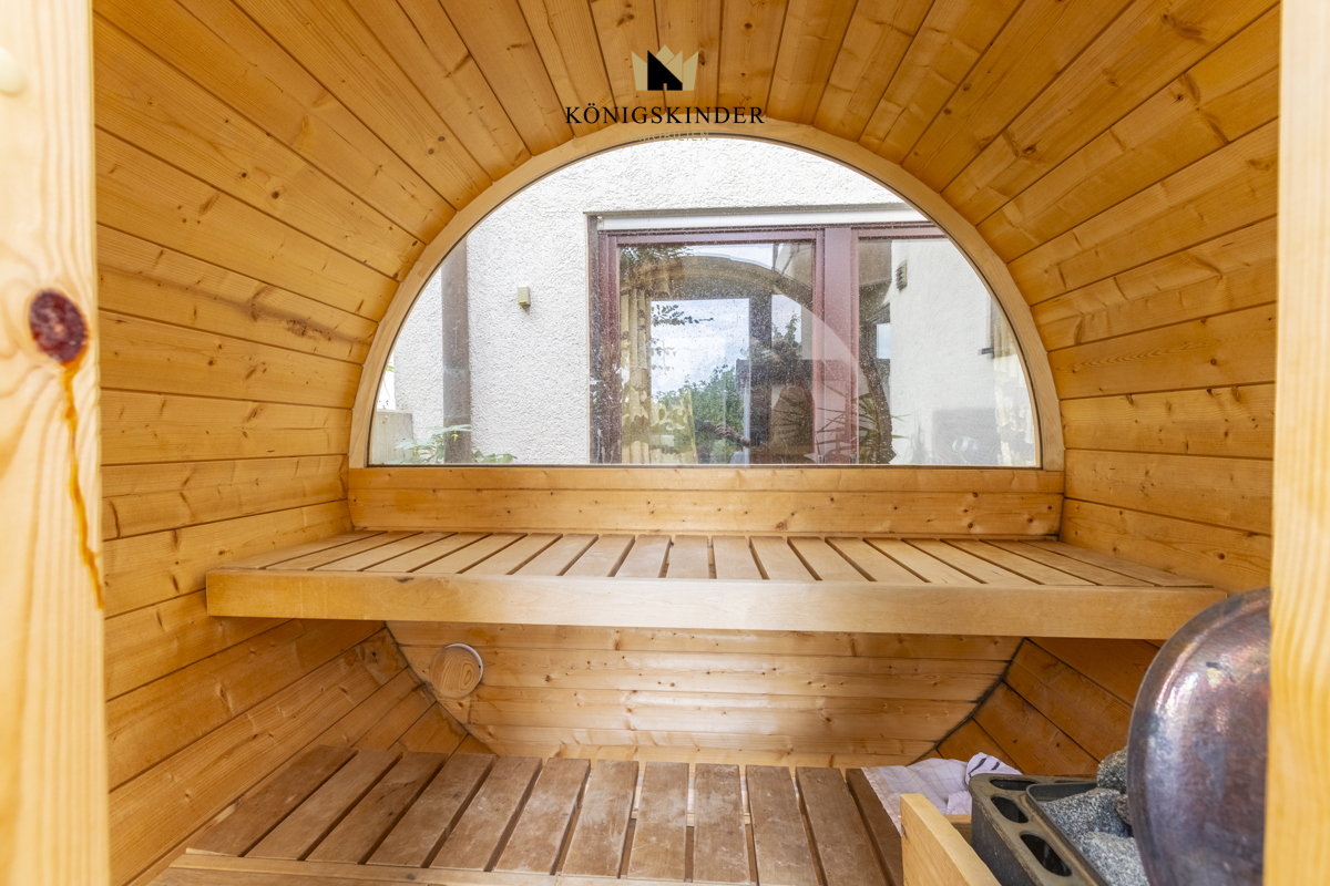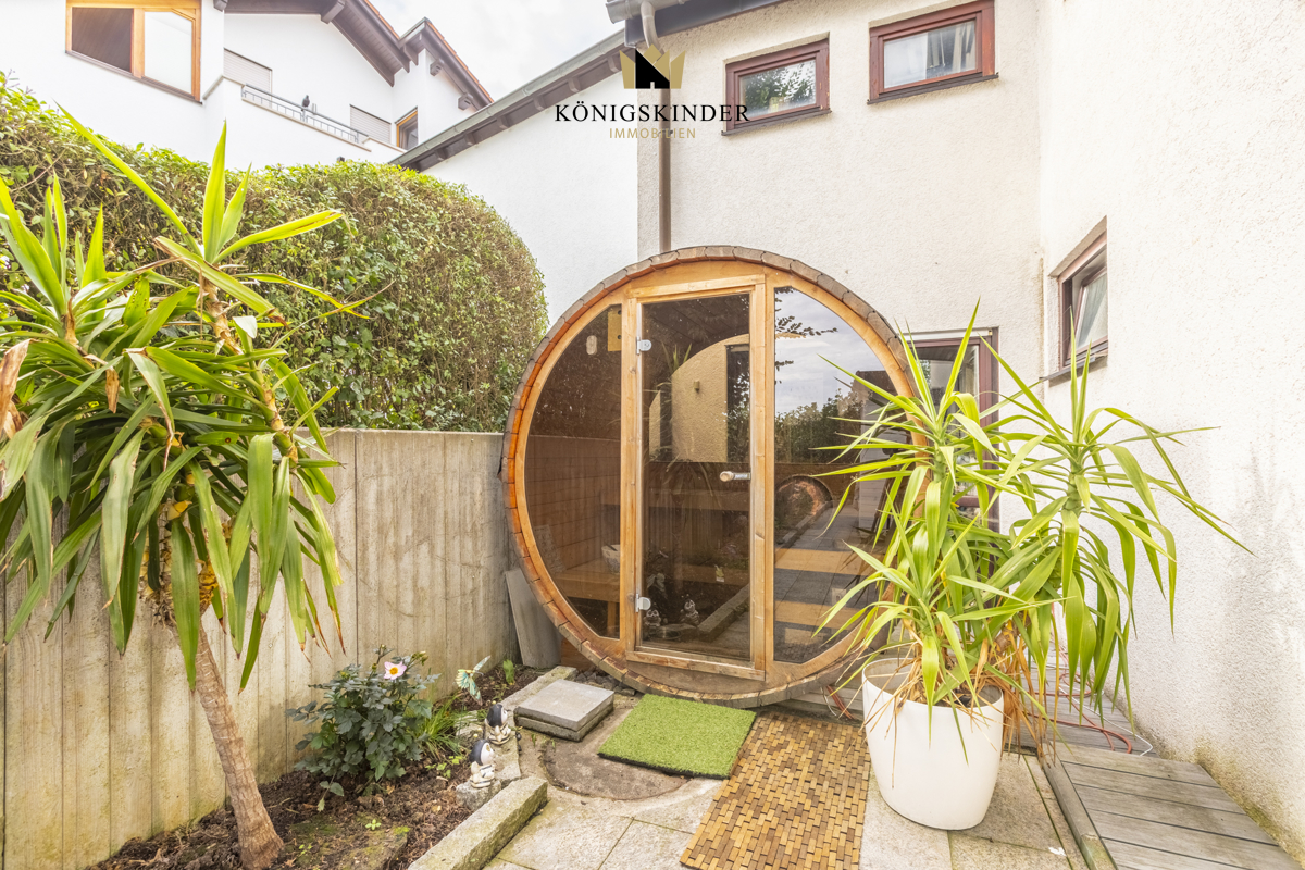 Der Terrassenbereich verbindet die beiden Wohneinheiten miteinander - eine kleine Gartensauna rundet das Wohnerlebnis ab.