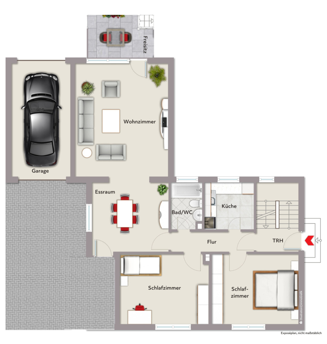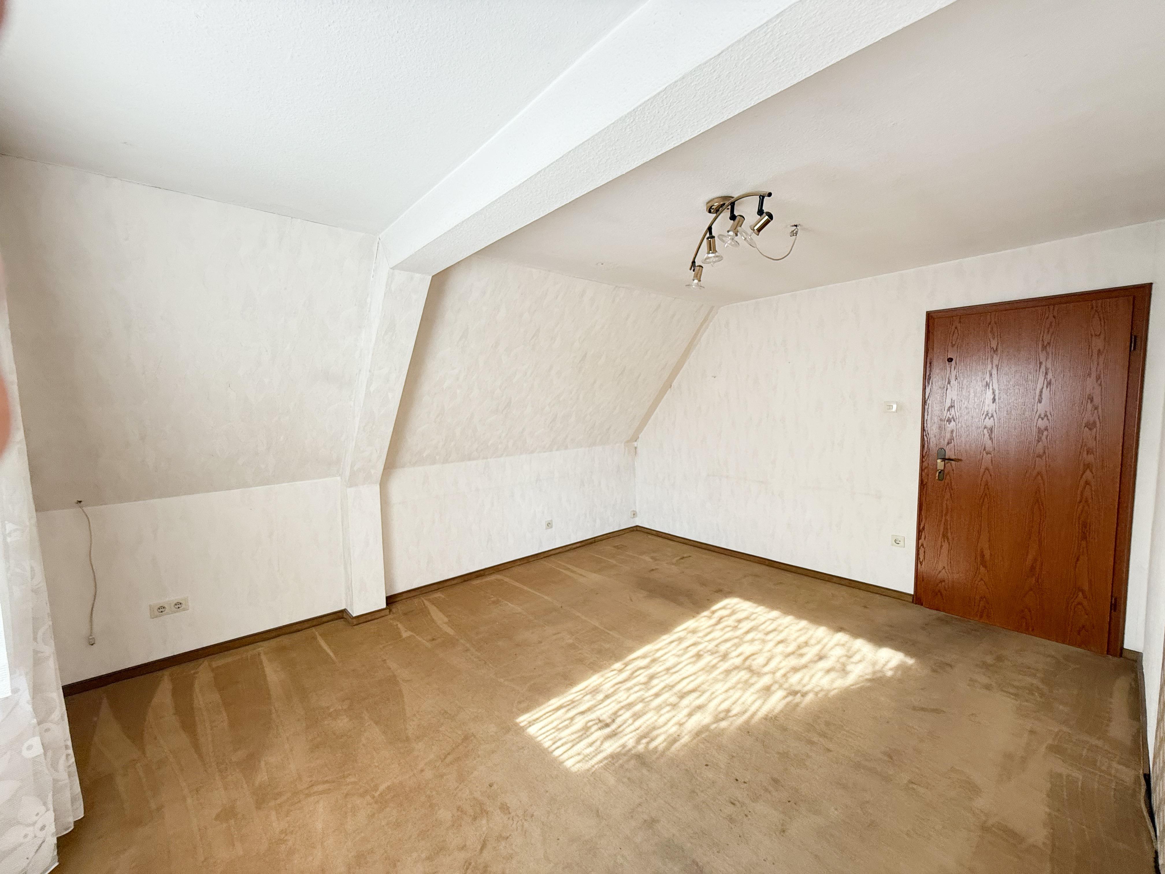 Im Erdgeschoss bilden das große Wohnzimmer und der angrenzende Essbereich das Herzstück des Hauses. Von hier aus gelangen Sie auf den erhöhten Freisitz und in den eingewachsenen Garten, der Privatsphäre und Geborgenheit bietet. Zwei weitere Zimmer sowie ein modernisiertes Badezimmer ergänzen diese Ebene.