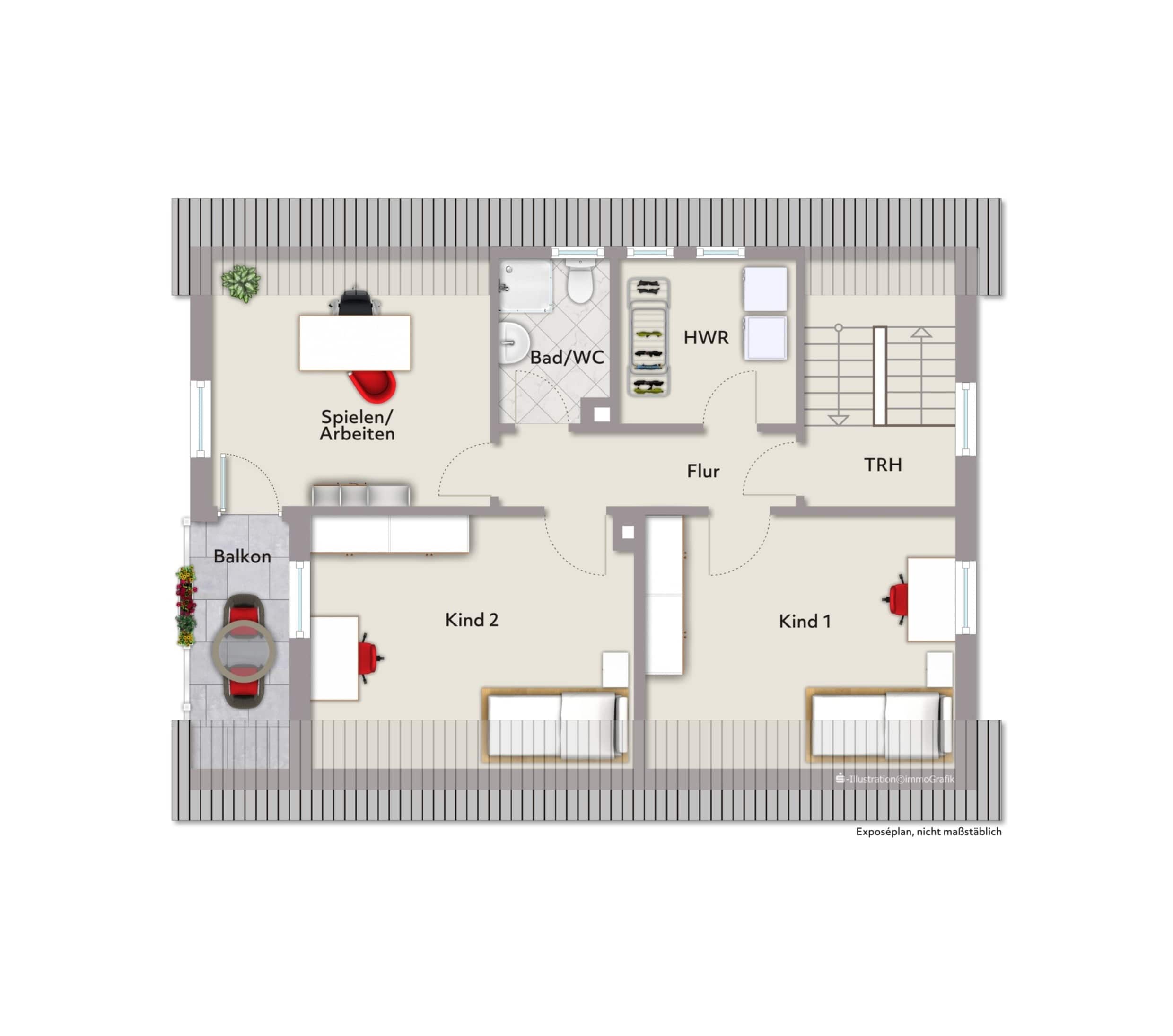 Das Dachgeschoss überrascht mit gleich drei Schlafzimmern und einer kleinen Küche, die sich als Hauswirtschaftsraum oder weiteres Bad eignet. Die westlich ausgerichtete Loggia lädt zum Genuss des Feierabends ein.
