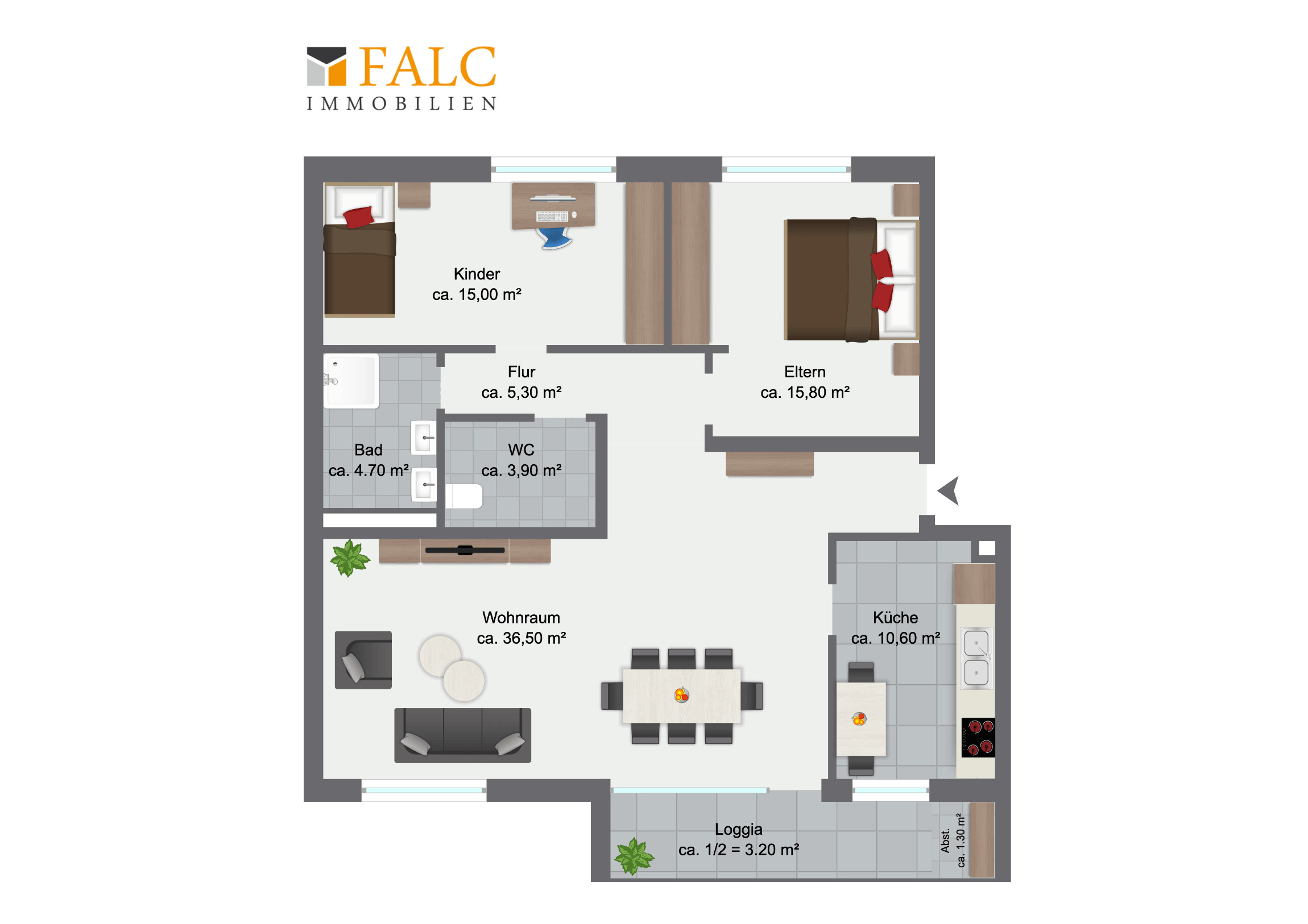 Ein besonderes Highlight ist die großzügige Loggia, die direkt an den Wohnbereich angrenzt. Sie lädt zum Entspannen im Freien ein, sei es beim Frühstück in der Morgensonne oder beim gemütlichen Ausklang des Abends. Praktisch: Die Loggia verfügt über eine außenliegende Abstellkammer, die zusätzlichen Stauraum für saisonale Gegenstände, Gartenmöbel oder Sportgeräte bietet.