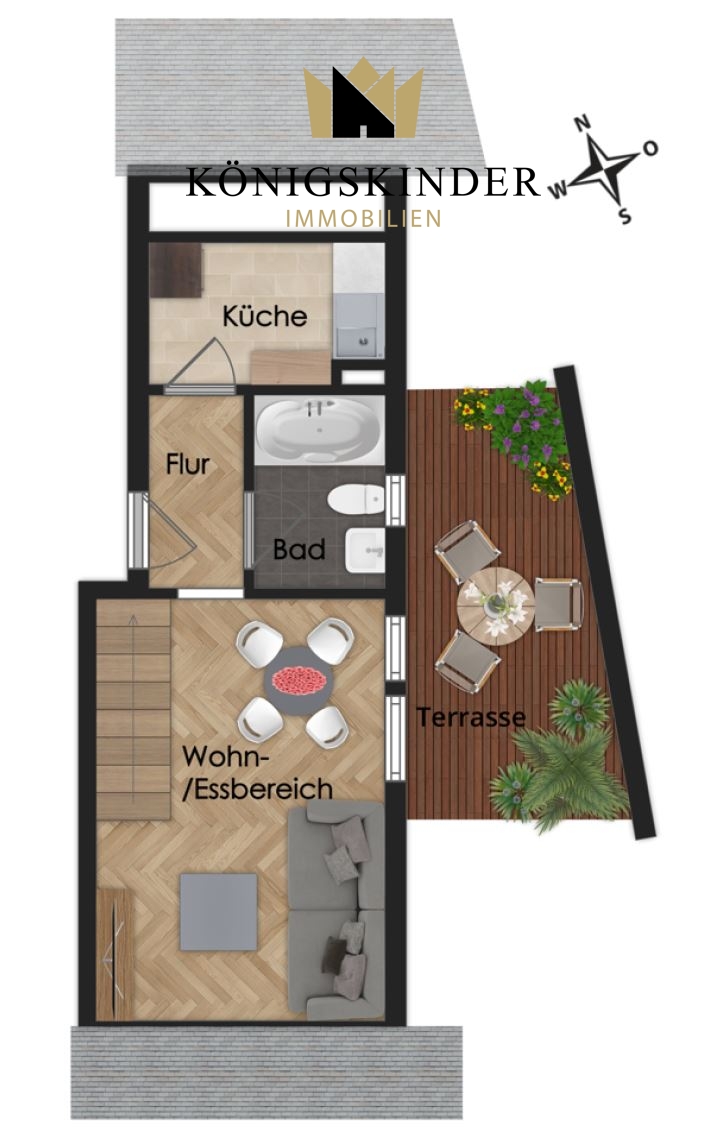 Blick zum Essplatz und Treppe zur EmporeSchlafplatz auf der EmporeKücheTageslichtbad mit WanneSüd-Ost-BalkonGrundriss 1. DachgeschossGrundriss 2. DachgeschossBlick zur gemütlichen WohnlandschaftBild