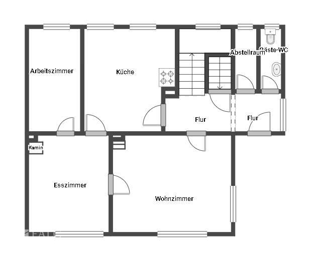 Das Erdgeschoss besticht durch eine durchdachte Aufteilung. Das helle Wohnzimmer bietet ausreichend Platz für geselliges Beisammensein. Die Fenster garantieren eine ausgezeichnete Belichtung, die die Räume freundlich und einladend wirken lässt. Die Küche lässt Raum für kreative Einrichtungsideen und wird durch einen direkten Zugang zum Esszimmer ergänzt. Ein zusätzliches Arbeitszimmer, ein kleiner Abstellraum und ein praktisches Gäste-WC vervollständigen das Raumangebot auf dieser Etage.