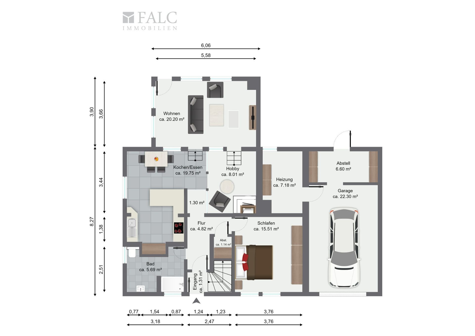 Das zweistöckige Haus besticht durch seine gut durchdachte Raumaufteilung und bietet vielseitige Nutzungsmöglichkeiten. Im Erdgeschoss finden sich großzügige Wohnräume, die zum Entspannen und Verweilen einladen. Die obere Etage beherbergt geräumige Schlafzimmer, die gemütliche Rückzugsorte bieten.