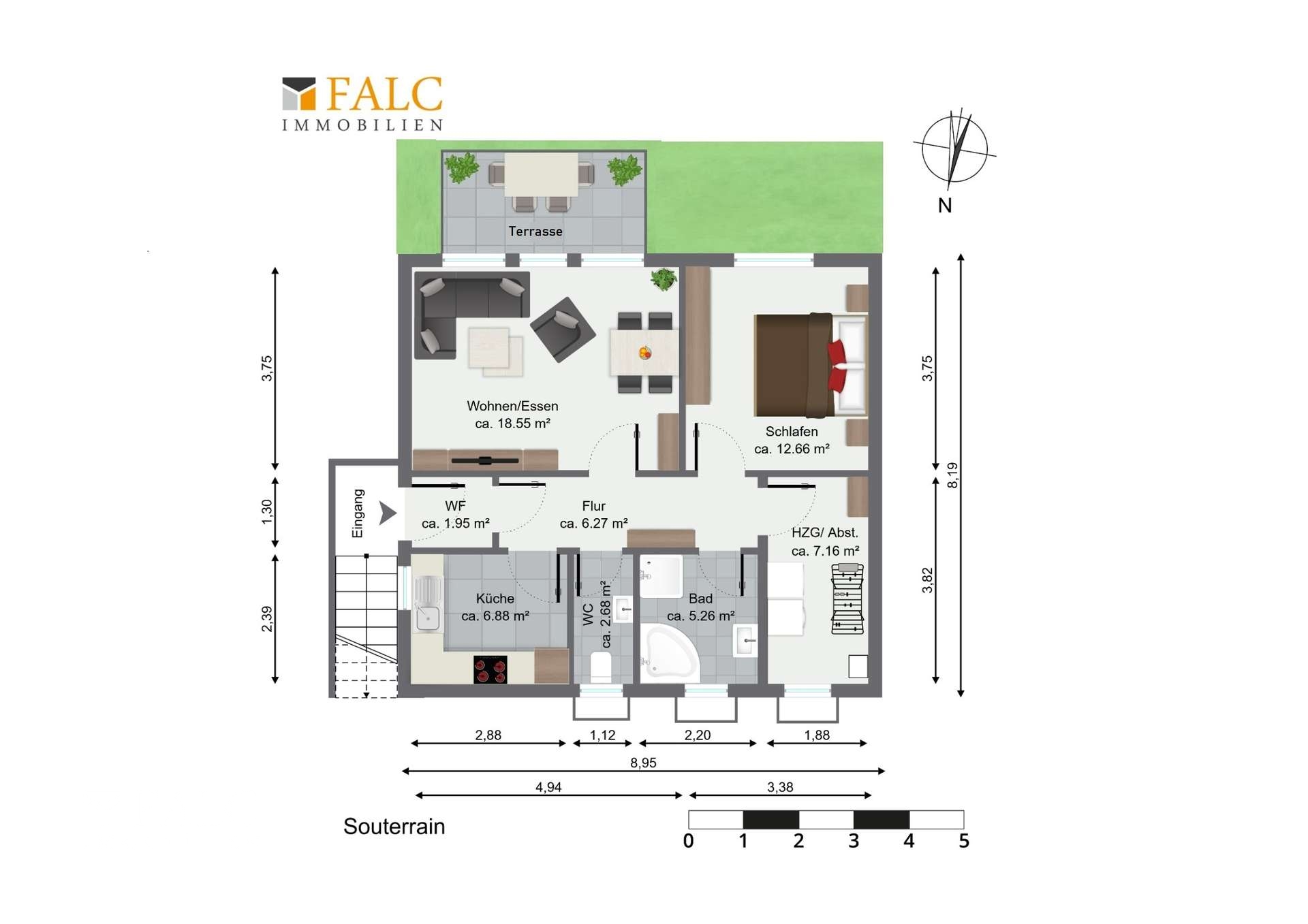 Im Souterrain finden Sie neben einer Waschküche, in der die Heizungsanlage verbaut ist, eine zusätzliche Rückzugsmöglichkeit für ein Familienmitglied oder die Option zur Untervermietung. Diese Einheit umfasst zwei Zimmer, eine Küche, ein Tageslicht-Bad, ebenfalls mit Wanne und fast ebenerdiger Dusche, ein Gäste-WC und eine Terrasse.