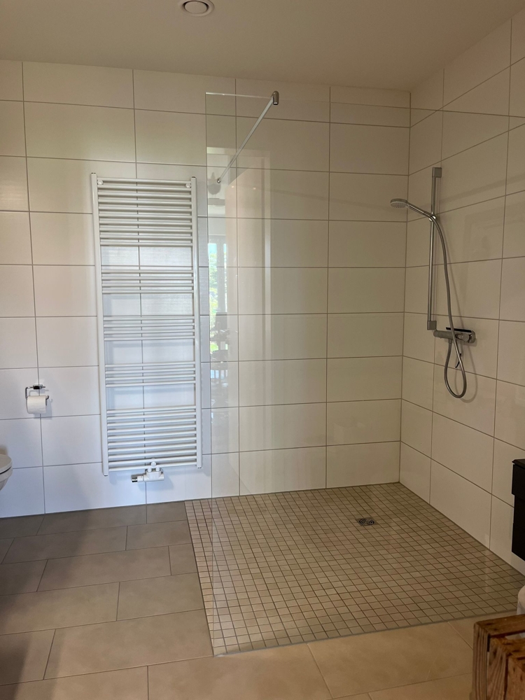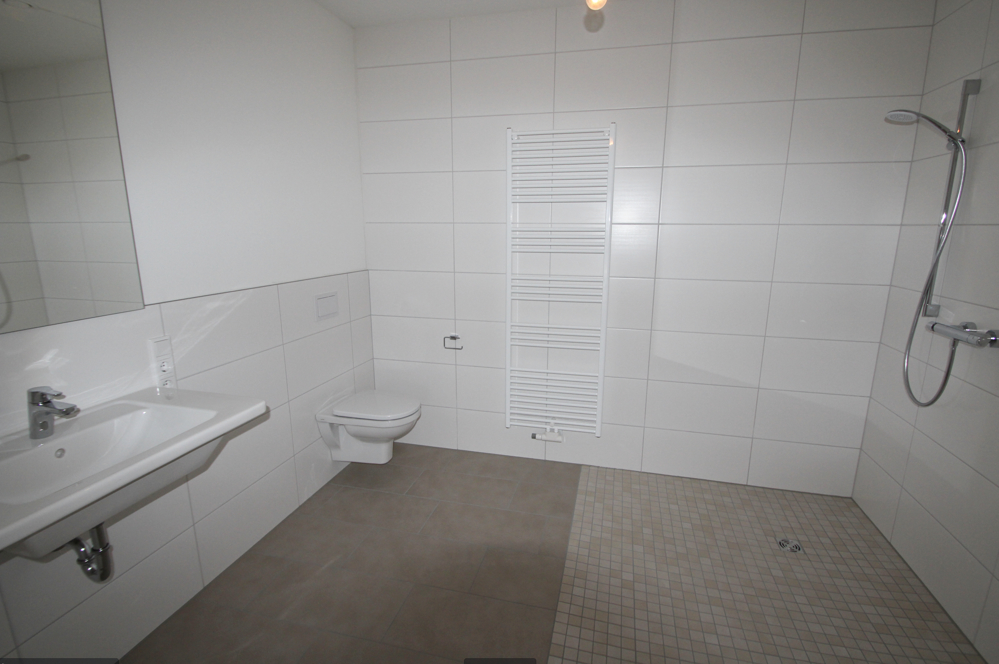 Badezimmer: - 1 Badheizkörper 60/180 cm in weiß - Sanitäre Einrichtungsgegenstände in weiß (Waschtischanlage, Duschplatz und WC)
