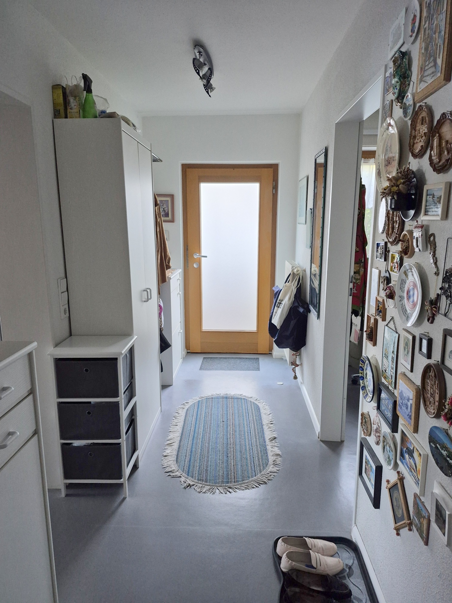 Die Hauptwohnung, mit ca. 175 m² Wohnfläche, erstreckt sich über das Erd- und Dachgeschoss und beeindruckt durch einen großen offenen Eingangsbereich. Die durchdachte Raumaufteilung, teilweise durch Einbauschränke getrennt, ermöglicht eine flexible Nutzung der Räume. Der Balkon bietet einen spektakulären Blick auf Basel und die umliegende Natur.