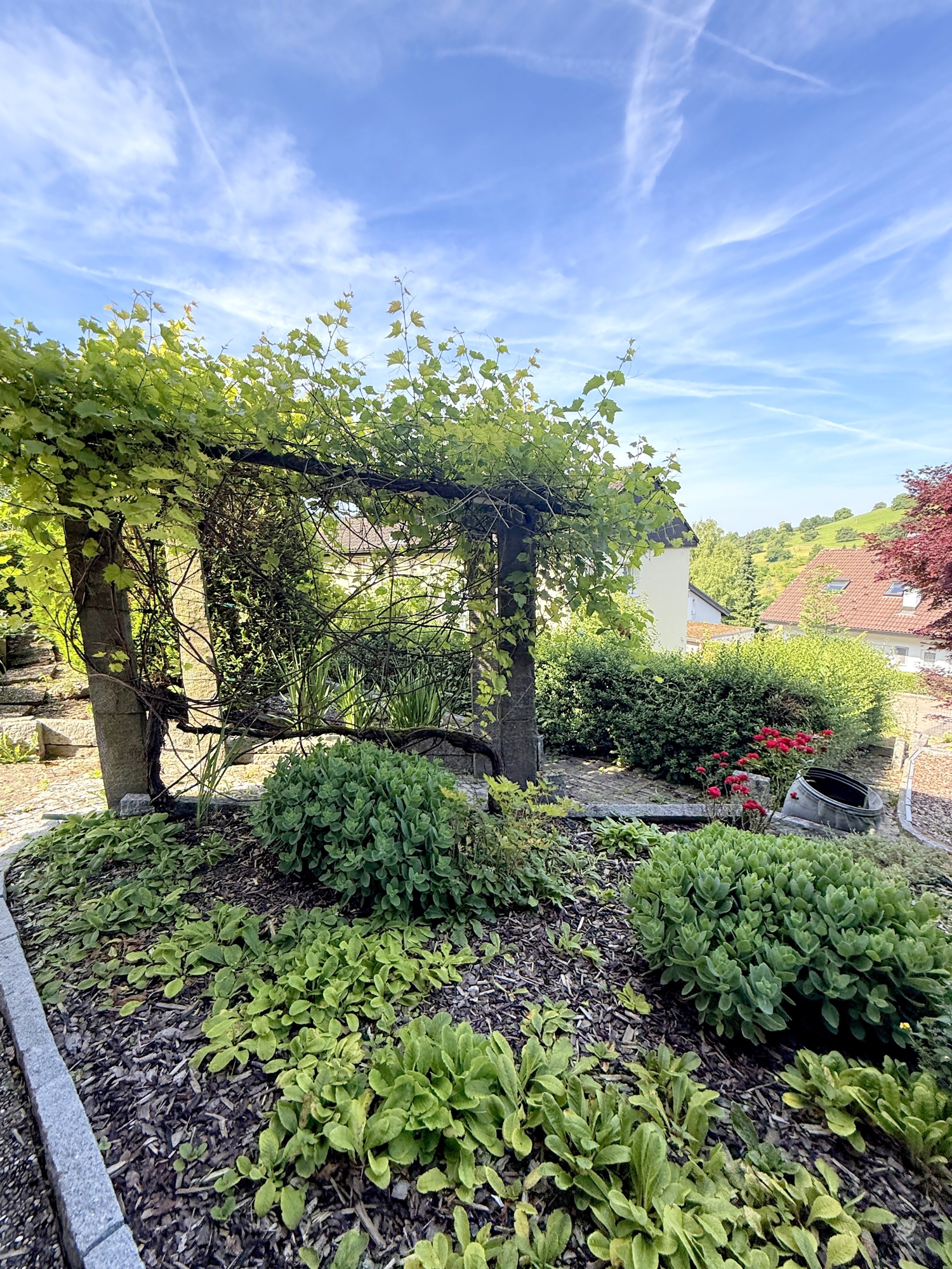 Der Garten bietet vielseitige Nutzungsmöglichkeiten und bietet einen überdachten Freisitz sowie Platz für z. B. Gemüseanbau oder Spielfläche für Kinder.
