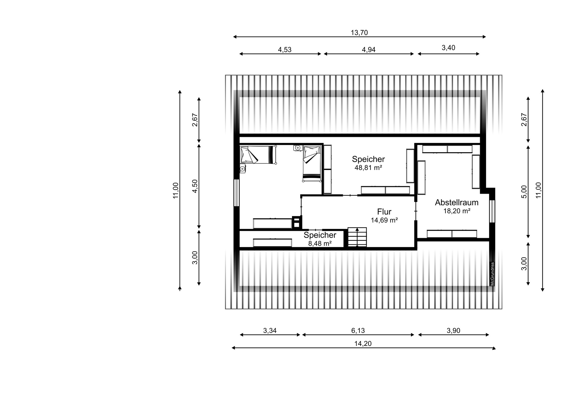 Im Dachgeschoss befinden sich zwei geräumige Zimmer, die als Kinder- oder Gästezimmer nutzbar sind. Das eine Zimmer verfügt über ein Waschbecken, das andere zusätzlich über eine separate Toilette. Ein großer Abstellraum und weiterer Stauraum im Kniestock nutzt den Raum unter der Dachschräge optimal aus.