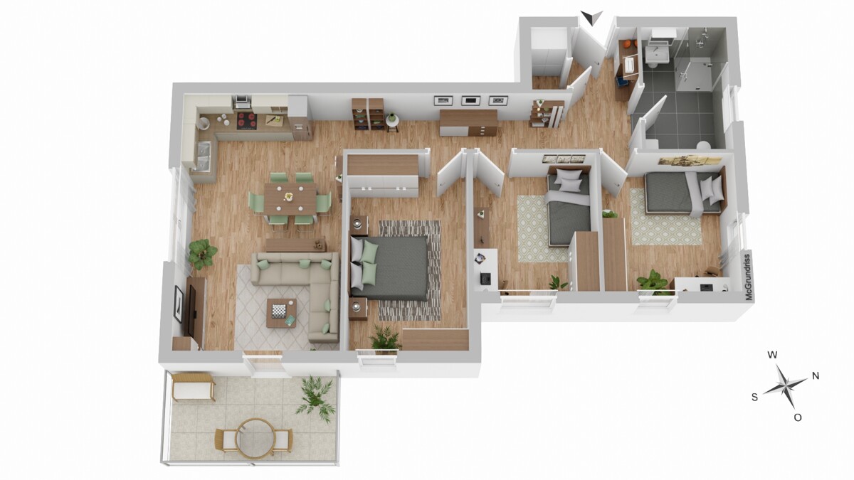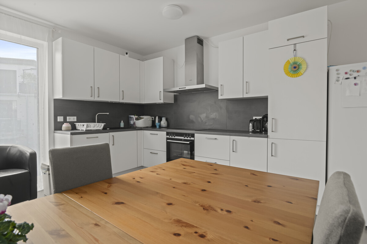 Im Inneren erwartet Sie eine hochwertige Einbauküche (EBK), ein großzügiger Wohn- und Essbereich mit Zugang zum Balkon, sowie drei Schlafzimmer, von denen eines bei Bedarf geöffnet werden kann, um den Wohnbereich zu erweitern. Das Badezimmer ist modern ausgestattet, verfügt über eine ebenerdige Dusche und ist somit komfortabel und barrierefreundlich.