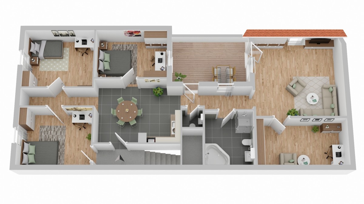 Das Obergeschoss überzeugt mit einem durchdachten Grundriss: – Drei gut geschnittene Schlafzimmer – Große Küche mit Platz für eine Kochinsel – Bad mit Badewanne und Dusche – Zusätzliches Gäste-WC – Helles Wohnzimmer mit großen Fenstern und LED-Spots – Ein weiteres Zimmer – ideal als Büro oder Hobbyraum