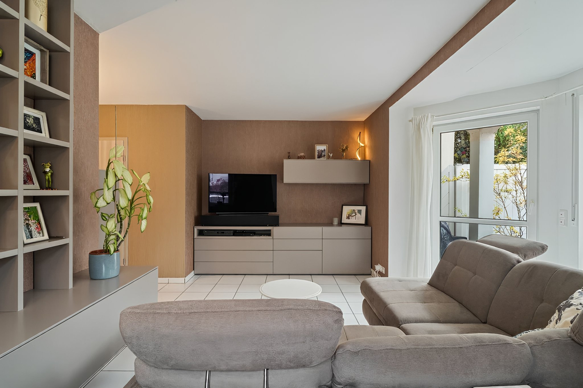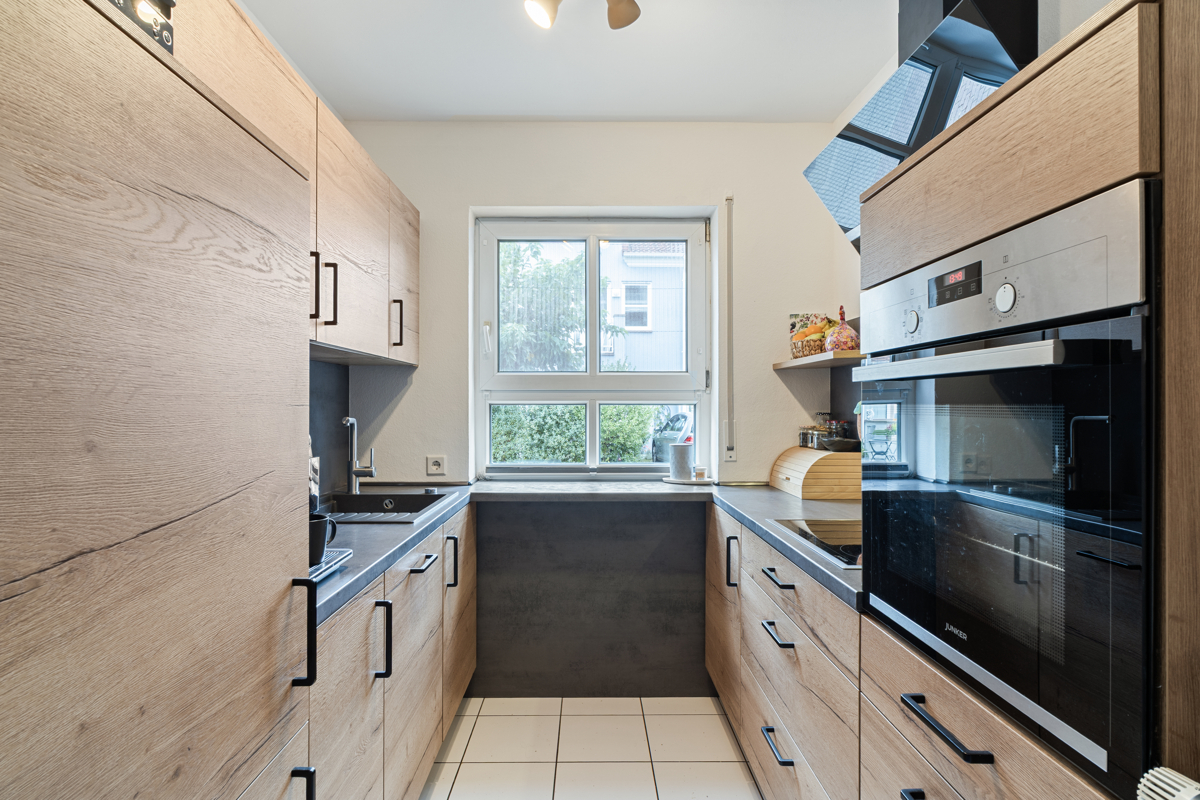 Am Ende einer kleinen Sackgasse steht das Mehrfamilienhaus, dessen Bauweise mit dem arkadenartigen Treppenhaus an die südlich geprägten Reihenhäuser der Umgebung anknüpft. Das Ensemble wirkt geschlossen und ruhig – ein Wohnumfeld, das gepflegt und überschaubar ist. Die Wohnung liegt im Erdgeschoss an der Frontseite des Hauses. Ein kleiner Eingangsbereich mit Platz für eine Garderobe führt in den Flur, der das Zentrum der Wohnung bildet. Rechts liegt die abgeschlossene Küche mit moderner Einbauküche in Holzoptik – funktional, gepflegt und in einem Stil, der sich dezent in das Gesamtbild fügt. Gleich daneben das Bad mit Wanne, Dusche und Tageslichtfenster, hell gefliest und neutral in der Gestaltung. Das Schlafzimmer bietet Platz für Bett und einen großen Schrank; zwei Fenster sorgen für angenehmes Licht. Wie alle Fenster der Wohnung sind sie mit Rollläden und Fliegengittern ausgestattet – praktisch im Alltag und besonders angenehm an warmen Tagen oder für ruhige Nächte. Ein kleiner Abstellraum im Flur nimmt Dinge auf, die man griffbereit, aber nicht sichtbar lagern möchte. Im Wohnzimmer öffnet sich der Raum über bodentiefe Fenster zur Terrasse hin. Der Erker verleiht der Fläche Struktur und lässt Licht aus mehreren Richtungen einfallen. Von hier führen zwei Türen auf die gepflasterte Terrasse – eine Erweiterung des Wohnraums, die in den warmen Monaten zum selbstverständlichen Aufenthaltsort wird. Eine Markise spendet Schatten, der Sichtschutz bietet Rückzug, ohne den offenen Charakter zu nehmen. Die Wohnung wirkt insgesamt klar gegliedert und stimmig. Weißer Fliesenboden, Türen in Holzoptik und dezente Farben schaffen ein ruhiges Gesamtbild. Alles ist kompakt, funktional und gut durchdacht – ideal für Menschen, die kurze Wege, Übersicht und eine einfache Handhabung schätzen. Ergänzt wird die Wohnung durch einen eigenen Hubparker – praktisch im Alltag und unmittelbar erreichbar.