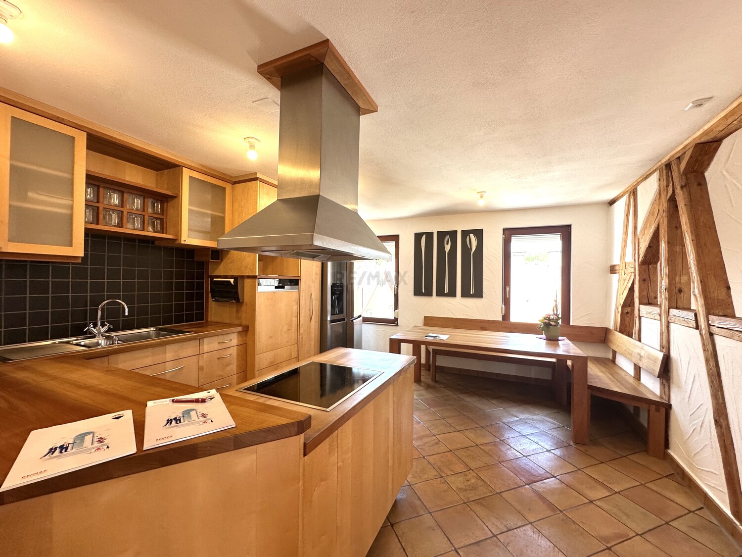 Große Wohnküche aus Massivholz mit Tisch und Eckbank & Side-by-Side-Kühlschrank Modernes Tageslichtbad Dachterrasse 1 Garage mit elektrischem Tor und 1 Stellplatz 2 Kellerräume, darunter ein Gewölbekeller Hochwertige Einbaumöbel Gas-Brennwertgerät und Kaminofen Alu-Flächenheizkörper Klimaanlage im Schlafzimmer Massivholzboden, Naturstein, Terra-Cotta, Kalkputz Wärme- und Schalldämmung