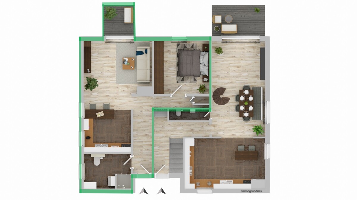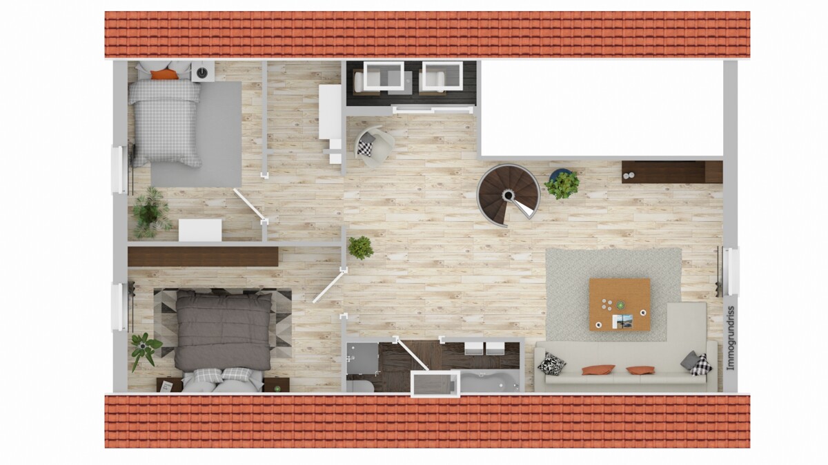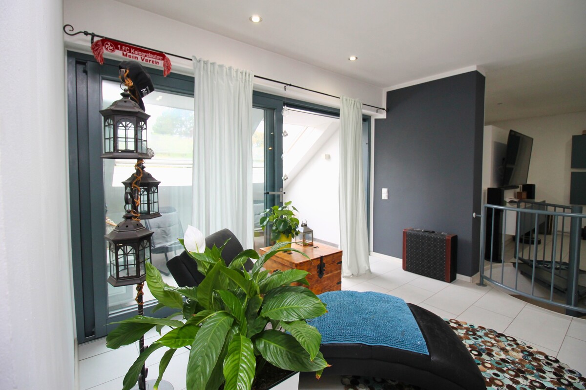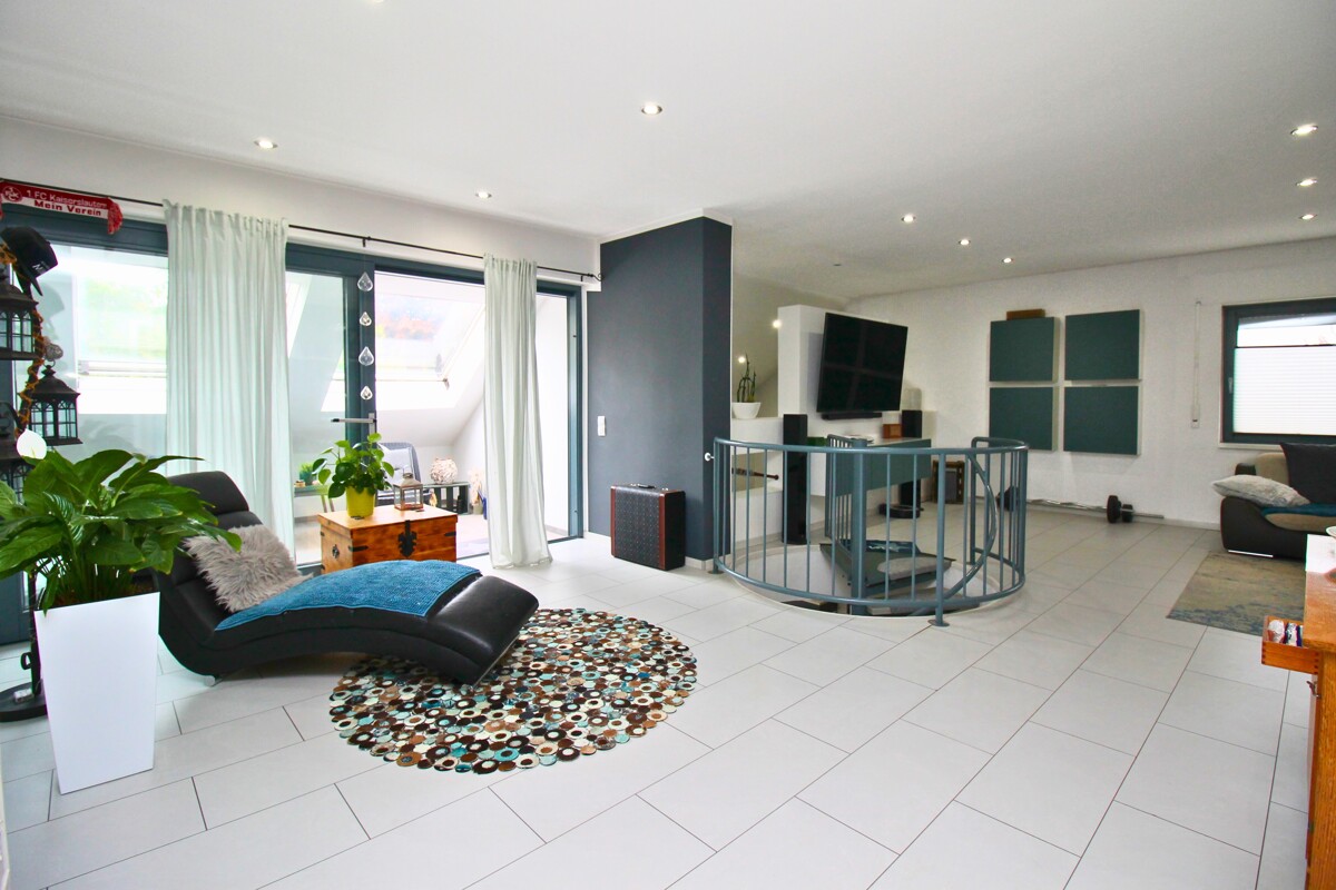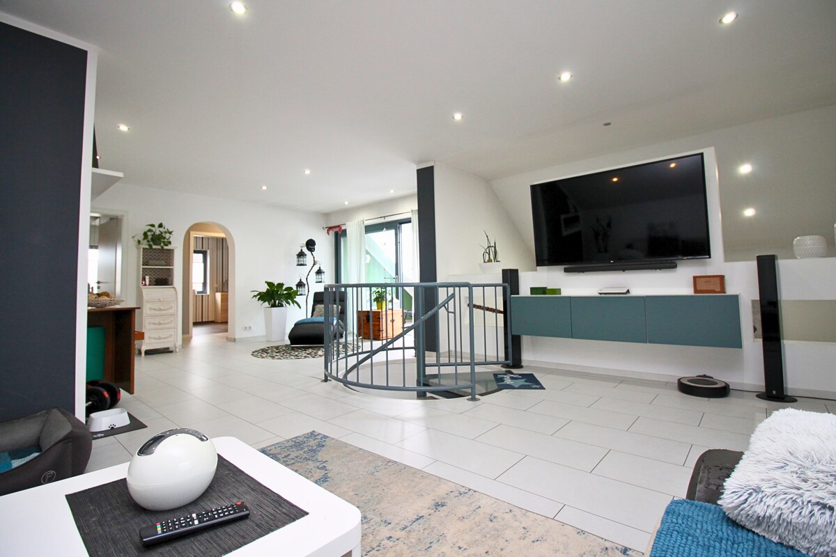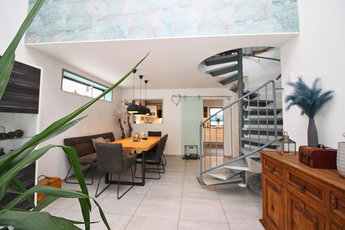 Über eine elegante Wendeltreppe gelangt man in das offene Wohnzimmer im Obergeschoss, das mit seiner Galerie-Optik ein besonderes Wohngefühl vermittelt. Zudem befinden sich hier zwei Schlafzimmer sowie ein schön geschlossener Balkon, der zum Entspannen einlädt.