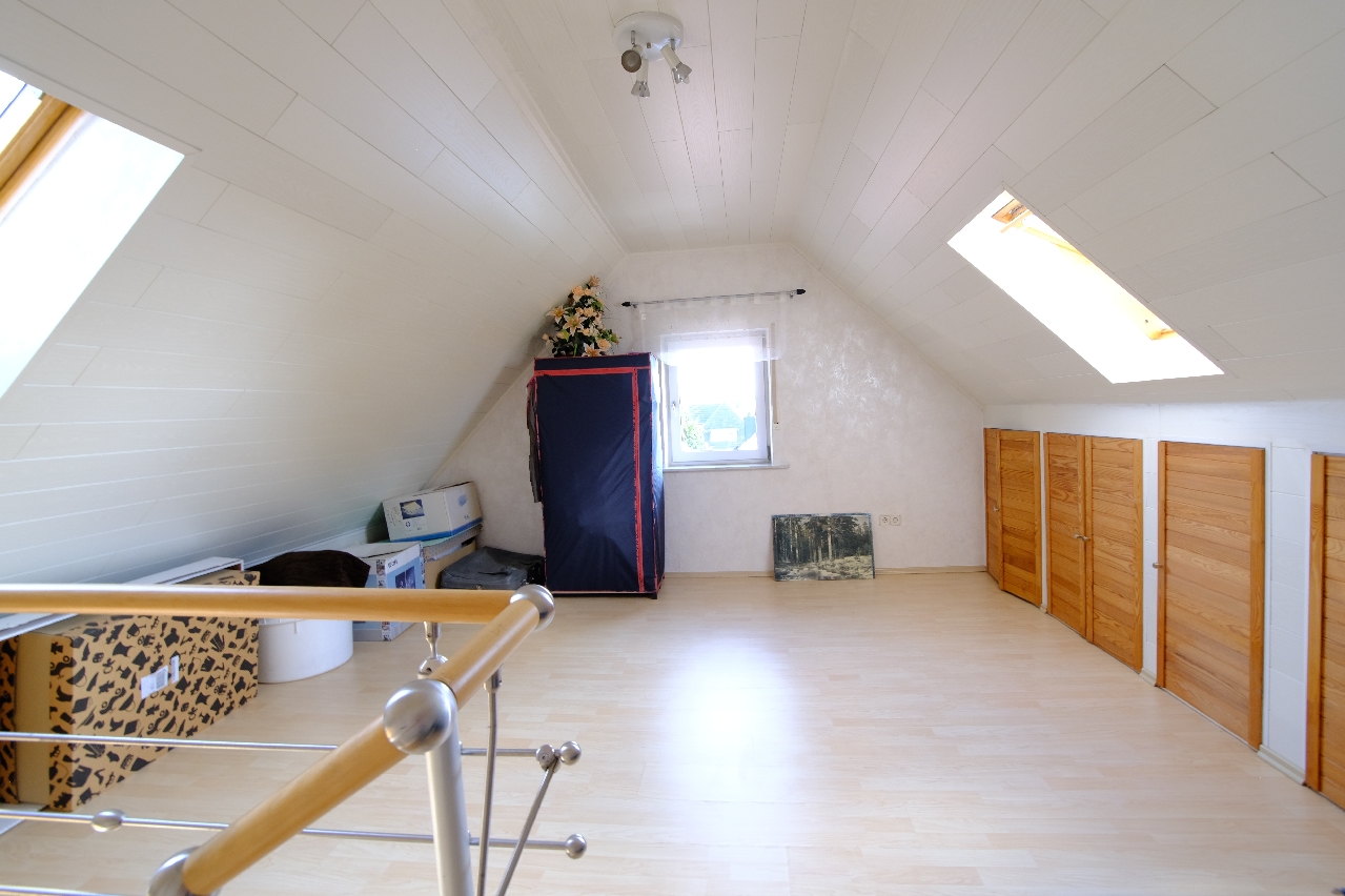 Spitzboden Der ausgebaute Spitzboden ist als heller Büroraum mit maßgefertigten Einbauschränken gestaltet und bietet damit nicht nur zusätzlichen Stauraum, sondern auch eine ruhige Arbeitsumgebung mit viel Tageslicht.