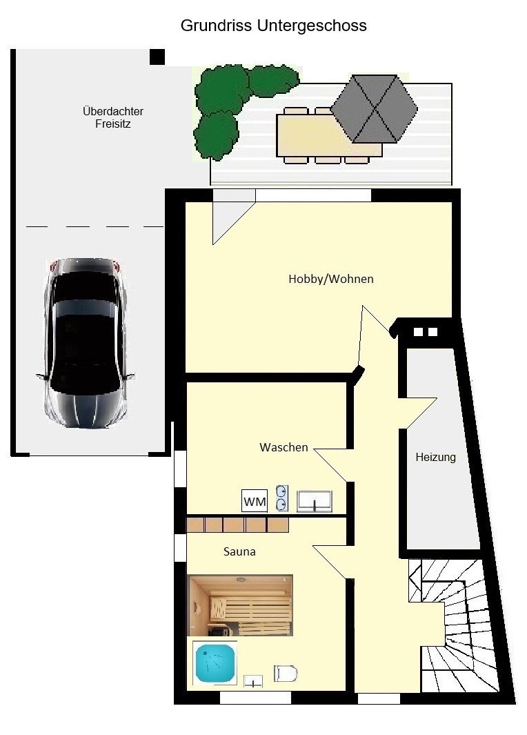 Kellergeschoss (beheizt) Besonders hervorzuheben ist das beheizte Kellergeschoss. Hier befindet sich ein großzügiger Hobbyraum mit direktem Zugang zur eigenen Terrasse und dem Garten – ein echtes Plus für Freizeitaktivitäten, Gäste oder als Spielbereich für Kinder. Der Flurbereich ist mit einer praktischen Abstellfläche unter der Treppe ausgestattet. Zusätzlich gibt es einen Saunaraum mit Dusche und WC, der Wellness-Momente im eigenen Zuhause ermöglicht. Eine Waschküche sowie der Heizungsraum ergänzen das Raumangebot im Untergeschoss.