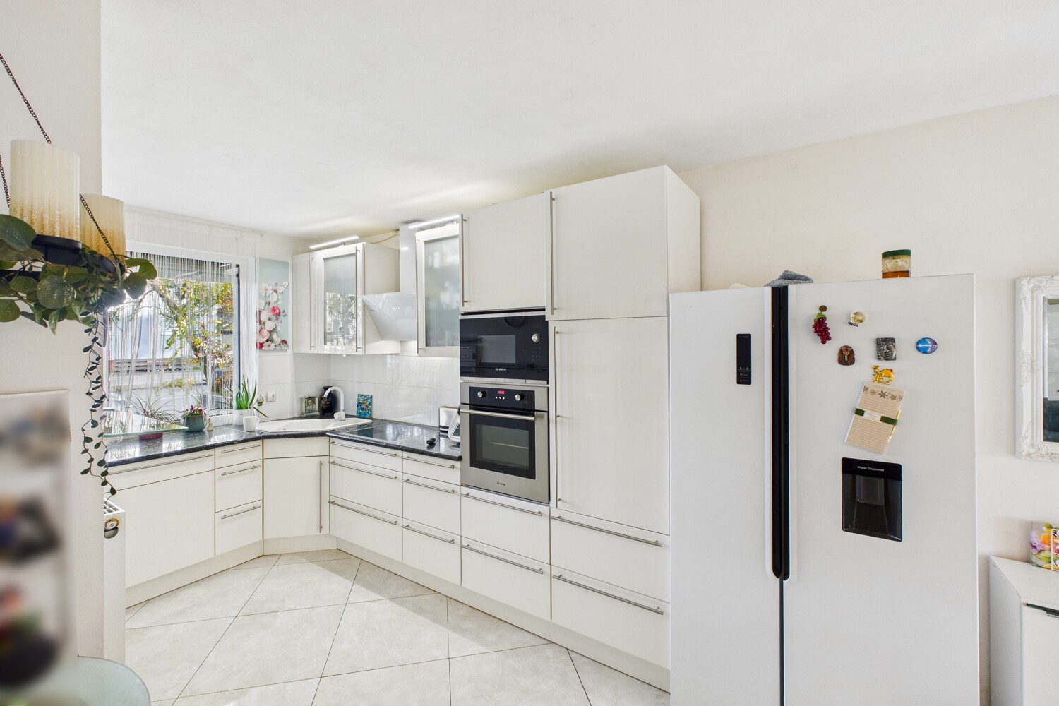 Der offene Wohn- und Essbereich mit angrenzender Küche bildet das Herzstück des Hauses und umfasst insgesamt ca. 38 m². Große Fensterflächen sorgen für Helligkeit und schaffen eine angenehme Verbindung zwischen Innen- und Außenbereich. Die Einbauküche von Nolte mit Granit-Arbeitsplatte fügt sich harmonisch in den Raum ein und kann nach individuellen Vorstellungen gestaltet werden.