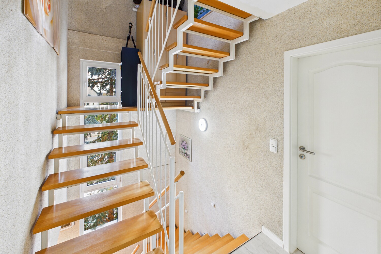 Im Eingangsbereich zeigt sich die gelungene Kombination aus Großzügigkeit und Helligkeit. Der Flur bietet ausreichend Platz und wird durch das große Fenster entlang der Treppe mit Tageslicht durchflutet. Hier befinden sich ein Abstellraum und ein Gäste-WC mit Fenster.