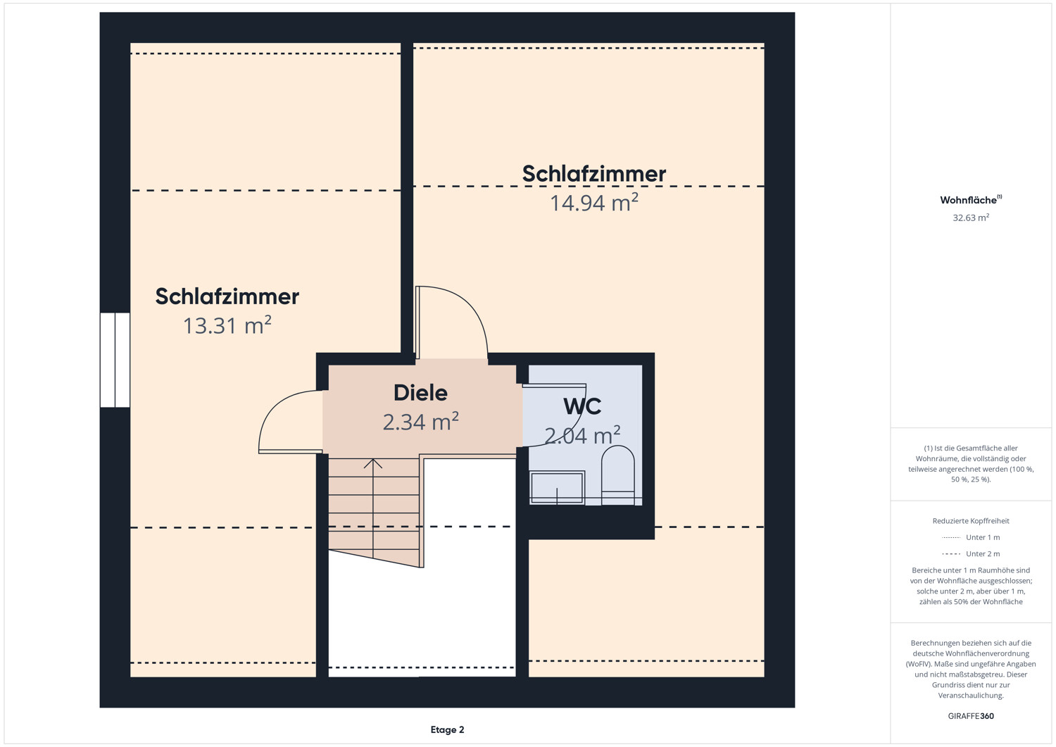 Im Dachgeschoss befinden sich zwei helle Räume und ein Gäste-WC ohne Fenster. Das linke Zimmer ist mit einem bodentiefen Fenster in südlicher Ausrichtung ausgestattet und erhält dadurch viel Licht. Das rechte Zimmer zeichnet sich durch seinen interessanten Grundriss aus und bietet verschiedene Nutzungsmöglichkeiten.