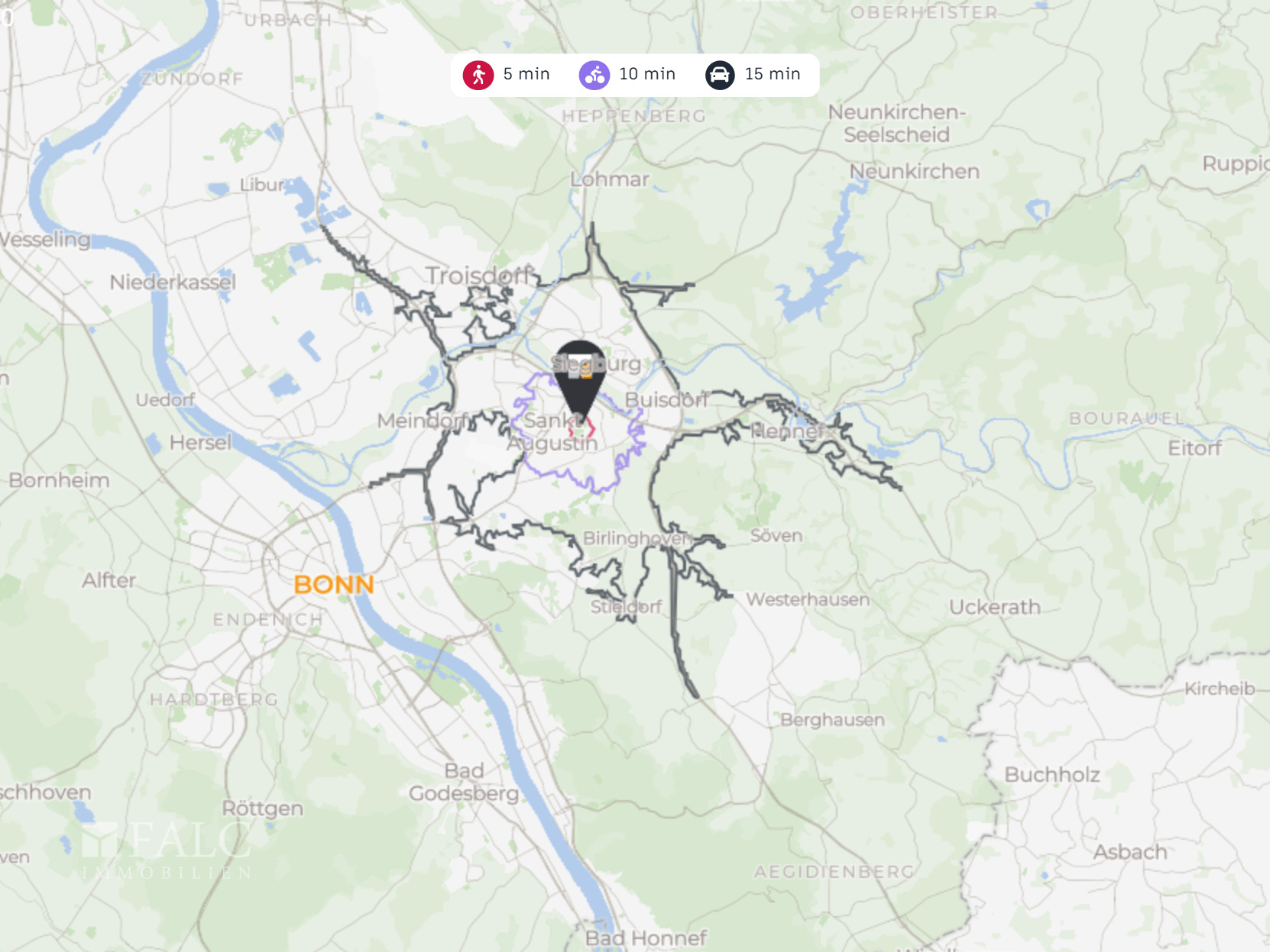 Die Anbindung an den öffentlichen Nahverkehr ist ausgezeichnet. Bushaltestellen sind nur wenige Gehminuten entfernt, und der Bahnhof Sankt Augustin Zentrum/Hochschule Bonn-Rhein-Sieg ist ebenfalls in der Nähe. Für Autofahrer ist die nächste Autobahnauffahrt in ca. 10 Minuten erreichbar, was eine schnelle Verbindung zu den umliegenden Städten ermöglicht. Der Flughafen Köln/Bonn ist in etwa 20 Minuten mit dem Auto zu erreichen.