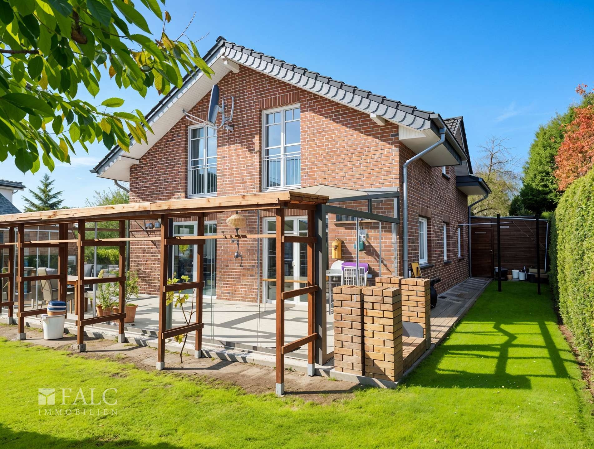Die Immobilie steht auf einem 600 m² großen Grundstück, das vielfältige Nutzungsmöglichkeiten bietet. Hinter dem Wintergarten erstreckt sich ein großer, pflegeleichter Garten, der viel Privatsphäre bietet und sowohl für Familienaktivitäten als auch für entspannte Stunden im Grünen ideal ist.