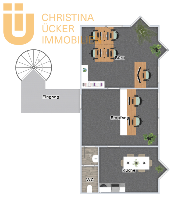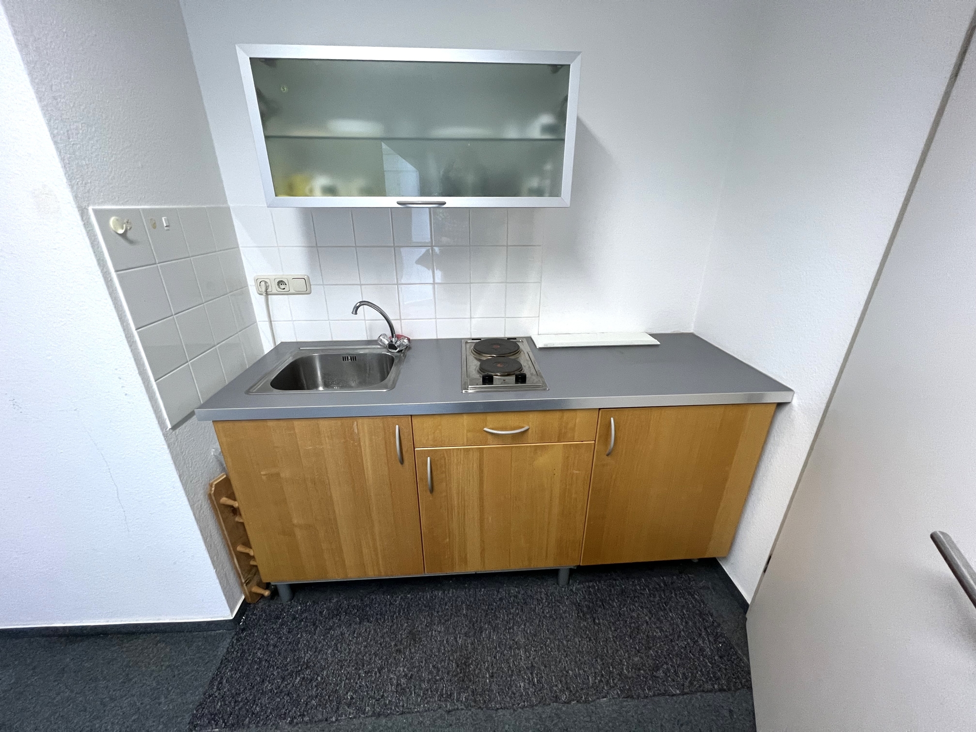 Der großzügige Büroraum links der Eingangstür bietet vielseitige Nutzungsmöglichkeiten – ideal für einen oder mehrere Einzelarbeitsplätze, die Teamarbeit oder als Besprechungsraum. Der einladende Empfangsbereich mittig der Einheit sorgt für einen positiven ersten Eindruck bei Kunden, Geschäftspartnern und Besuchern. Eine praktische Küche rechts des Eingangs steht für Pausen oder kleinere Besprechungen zur Verfügung. Ein gepflegtes, gefliestes WC rundet das Raumangebot ab.
