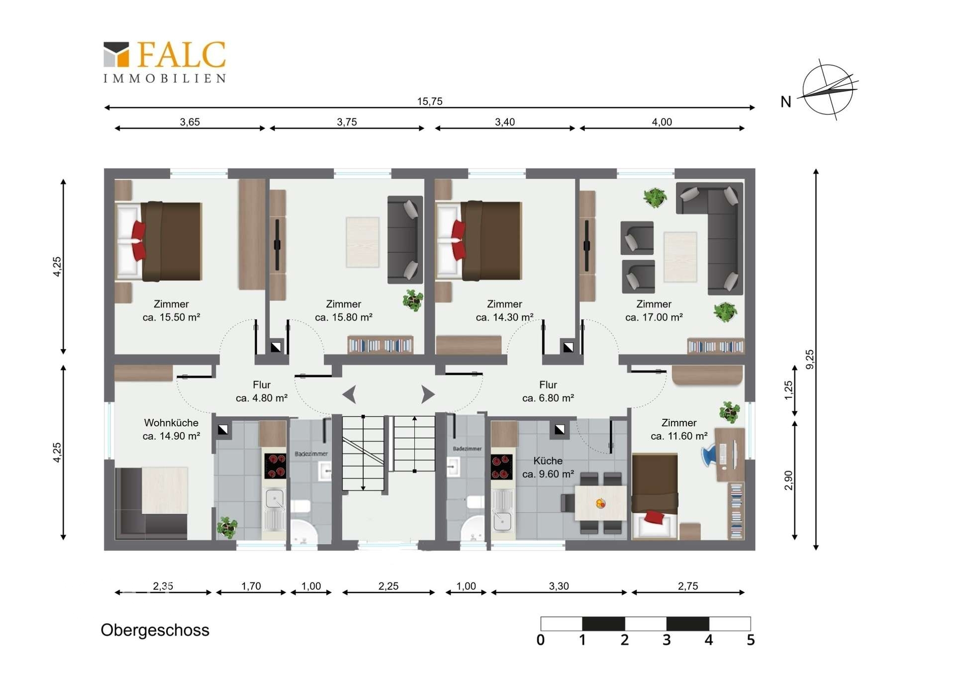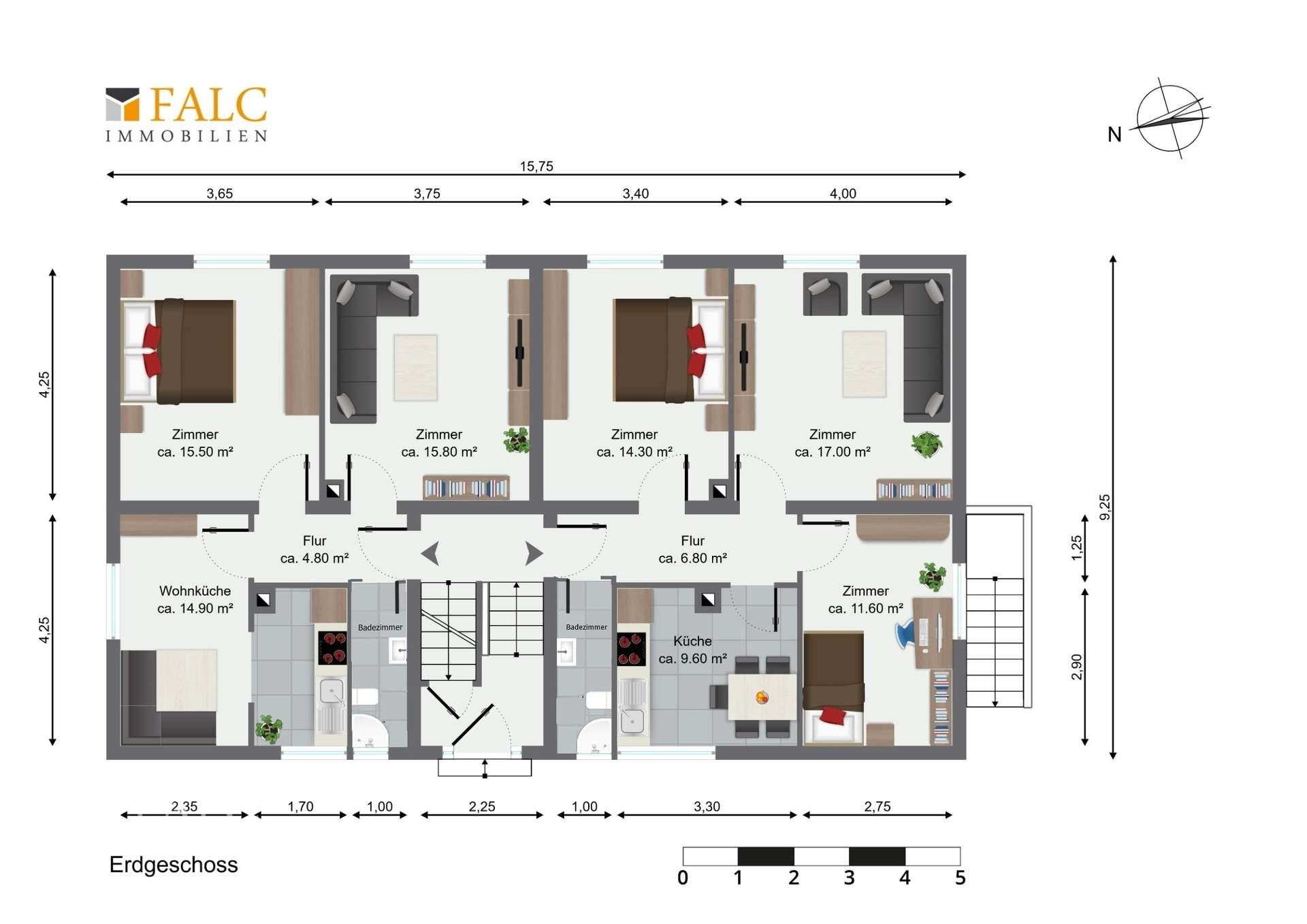 Erd- und Obergeschoss: Beide Etagen verfügen über denselben praktischen Grundriss. Nach dem Betreten der Wohnung gelangt man in einen einladenden Flur, der ausreichend Platz für Garderobe und Stauraum bietet und gleichzeitig als zentraler Zugang zu allen Räumen dient. Das Tageslichtbad ist mit Dusche oder Badewanne, WC und Waschbecken ausgestattet – hell, pflegeleicht und funktional. Ein weiteres Zimmer eignet sich flexibel als Kinder-, Arbeits- oder Gästezimmer, während das zweite Schlafzimmer ein gemütliches Rückzugsdomizil für Paare bietet. Die linken Wohnungen verfügen über einen offenen Wohn-, Ess- und Küchenbereich auf rund 50 m², während die rechten Wohnungen mit einem zusätzlichen Zimmer und einer separaten Küche auf etwa 59 m² etwas mehr Raum bieten. Große Fensterflächen sorgen in allen Einheiten für eine freundliche und lichtdurchflutete Atmosphäre.