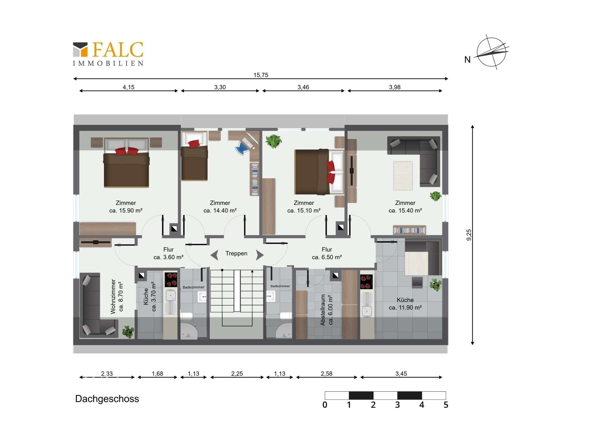 Dachgeschoss: Auch hier befinden sich zwei charmante Wohneinheiten. Die linke Wohnung bietet auf ca. 46,4 m² zwei Zimmer und einen offenen Ess-Küchenbereich. Die rechte Einheit verfügt über etwa 54,4 m², zwei großzügige Zimmer, eine separate Küche sowie einen praktischen Abstellraum – perfekt für zusätzlichen Stauraum oder Vorräte.