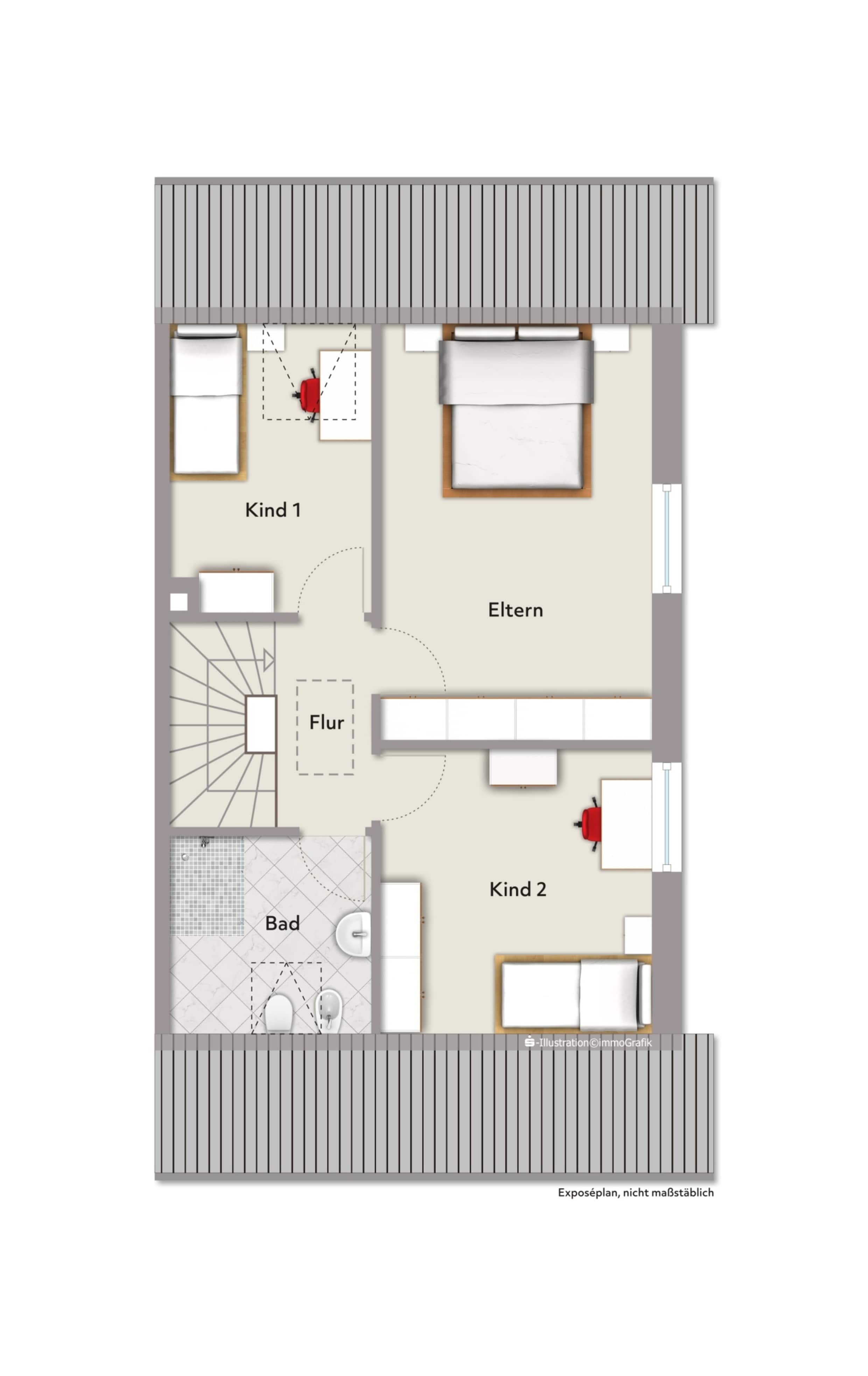 Im oberen Geschoss stehen drei gut geschnittene Schlafzimmer zur Verfügung. Das modernisierte Bad mit großzügiger Dusche, Bidet, Handtuchheizkörper und Fußbodenheizung schafft eine angenehme Wohlfühlatmosphäre. Ein zusätzlich als Hobbyraum genehmigter Raum im Spitzboden erweitert die Nutzbarkeit ideal – ob als Homeoffice oder Spiel- bzw. Jugendzimmer.