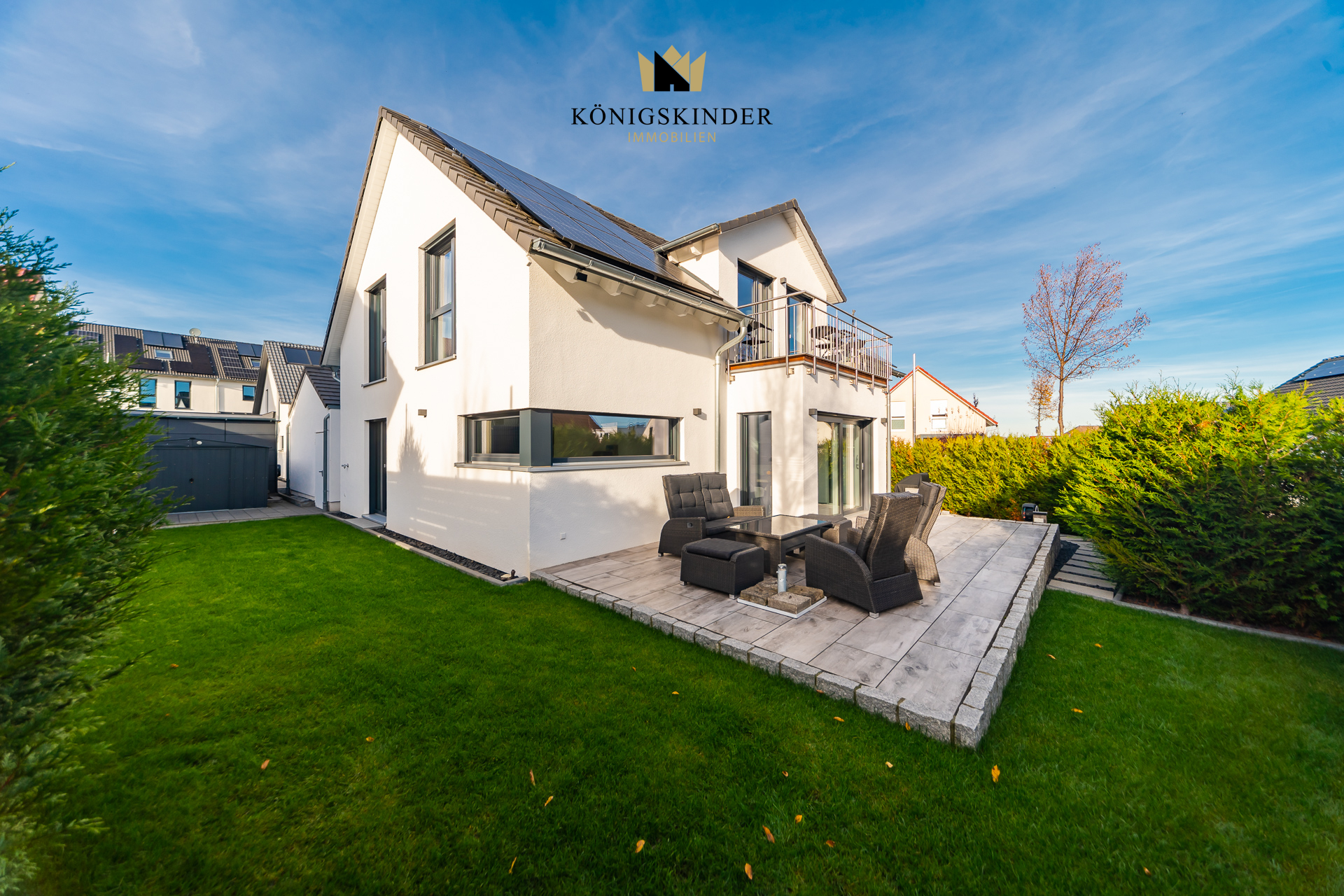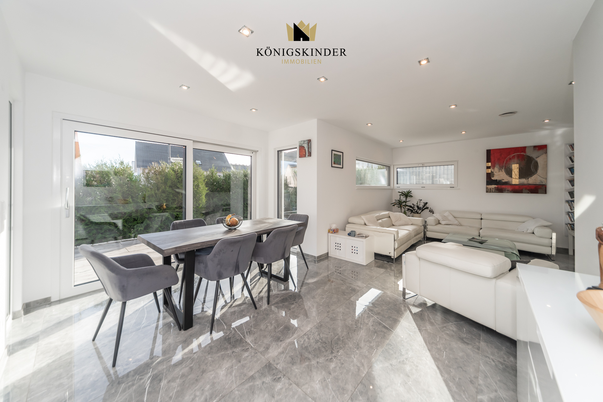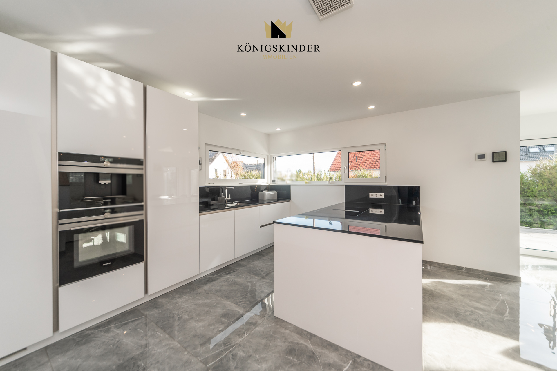 Das Haus verfügt über drei Bäder und eine hochwertige, offene Einbauküche, die Funktionalität und Stil vereinen. Eine großzügige Doppelgarage sowie ein separater Stellplatz bieten ausreichend Platz für Fahrzeuge und Abstellbedarf. Zusätzlich sorgt eine Luft-Wärme-Pumpe für effiziente Heizung und Warmwasserbereitung. Insgesamt verbindet das Haus moderne Technik, bauphysikalische Qualität und eine anspruchsvolle Innenraumgestaltung zu einem zeitlosen Wohnkonzept.