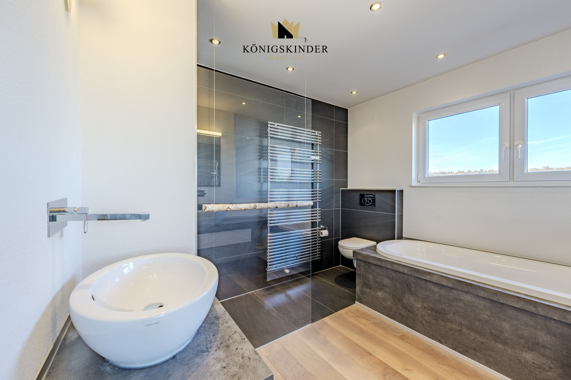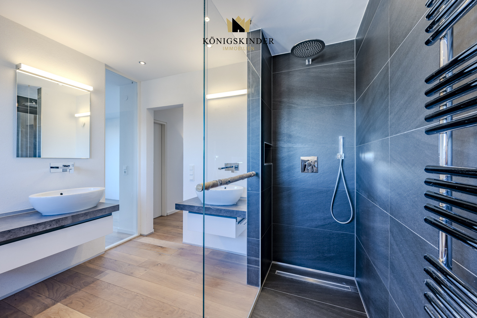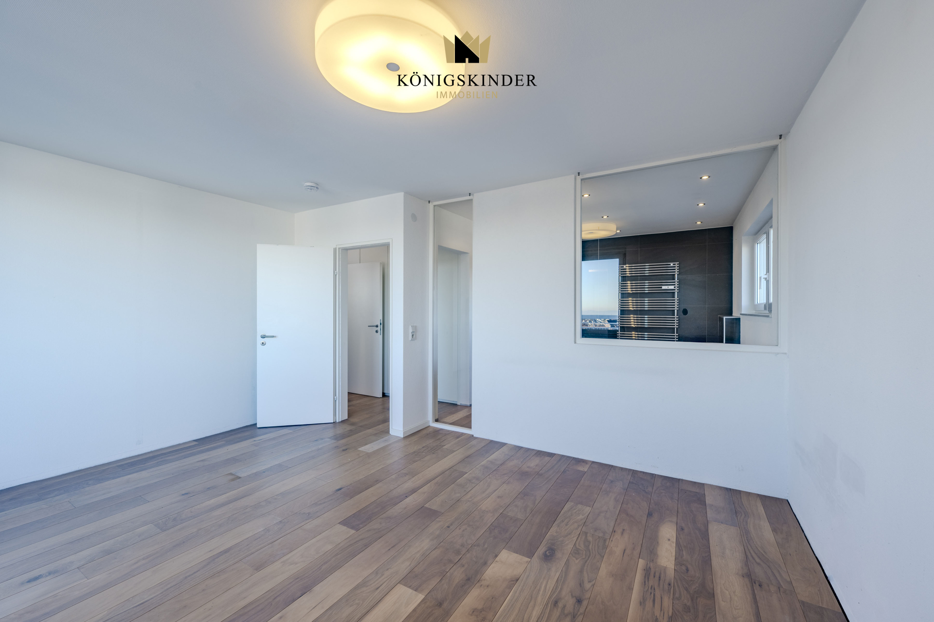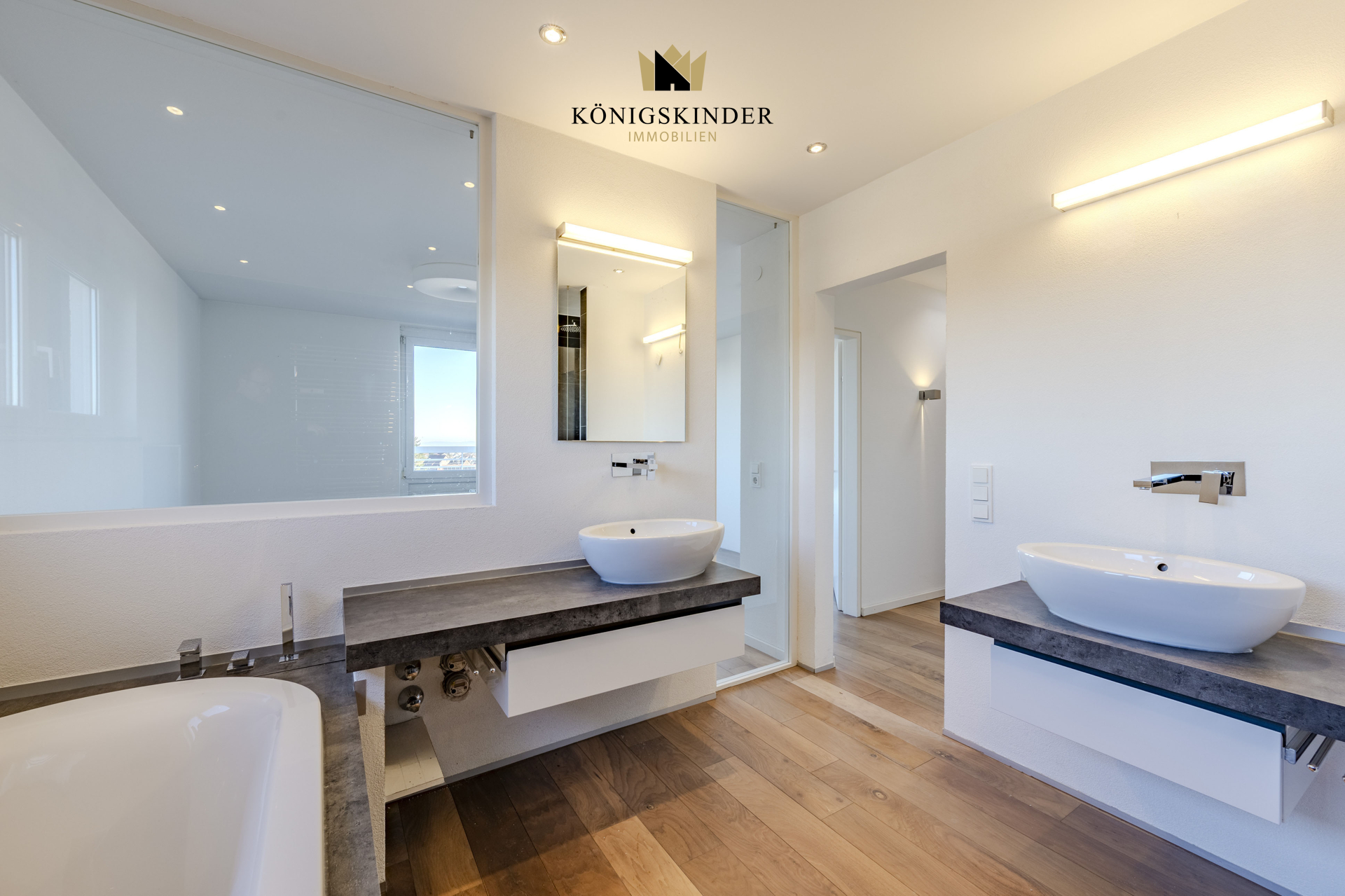 Über einen Flur gelang man zu einem weiteren Kinder- Arbeits- oder Gästezimmer und zum Hauptschlafzimmer, welches zum Badezimmer hin mit Glaselementen abgeteilt ist. Das luxuriöse Badezimmer verfügt über eine begehbare Dusche und eine großzügige Badewanne. Das Schlafzimmer hat einen Zugang zu einem Holzdeck auf der Dachterrasse, welches sich hervorragend für eine Außensauna eignet.
